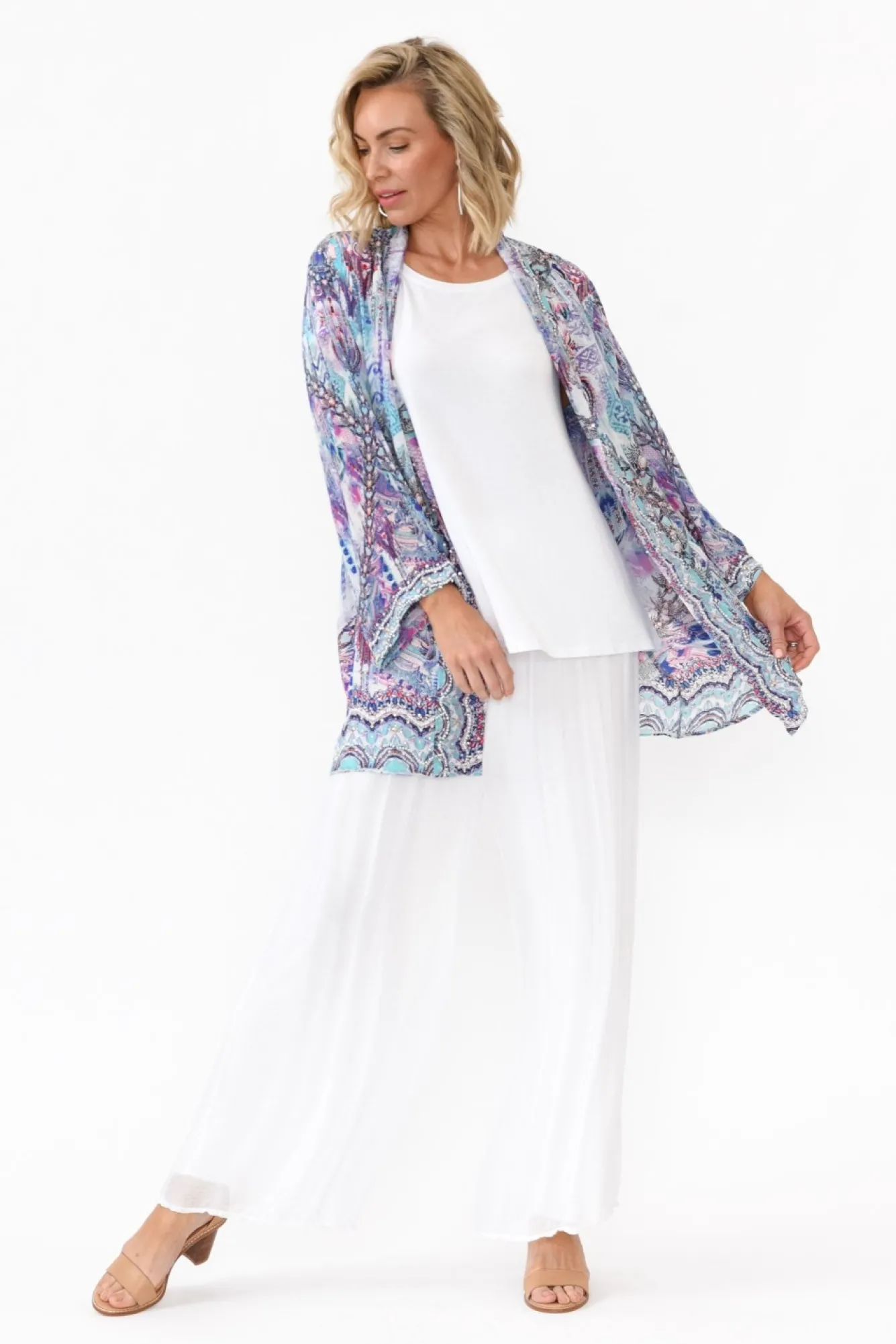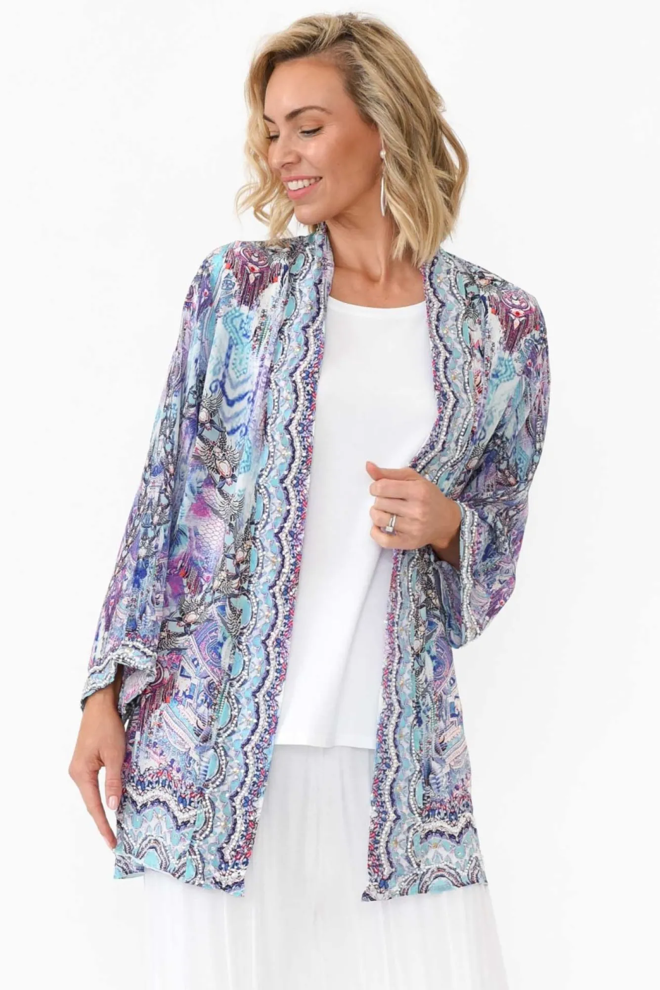 Fit: True To Size. Refer To Size & Fit Tab Below For Specific Size RecommendationNNfabric: 100% SilkNa Statement Kimono Made From Ultra-Soft, Lightweight And Non-Stretch Silk Fabric With A Subtle Elevated Sheen Neffortless Open-Front Design Nlapels And Cuffs Are Adorned With Silver And Gold Embellishments N3/4 Length Sleeves Fall Just Below The Elbow NNrelaxed Kimono Silhouette – Perfect For Light Layering NNcascades Below Hip LengthNNNcare: Specialist Dry Clean OnlyNNcolour: Pastel Blue And Purple In A Bohemian-Inspired Abstract Print