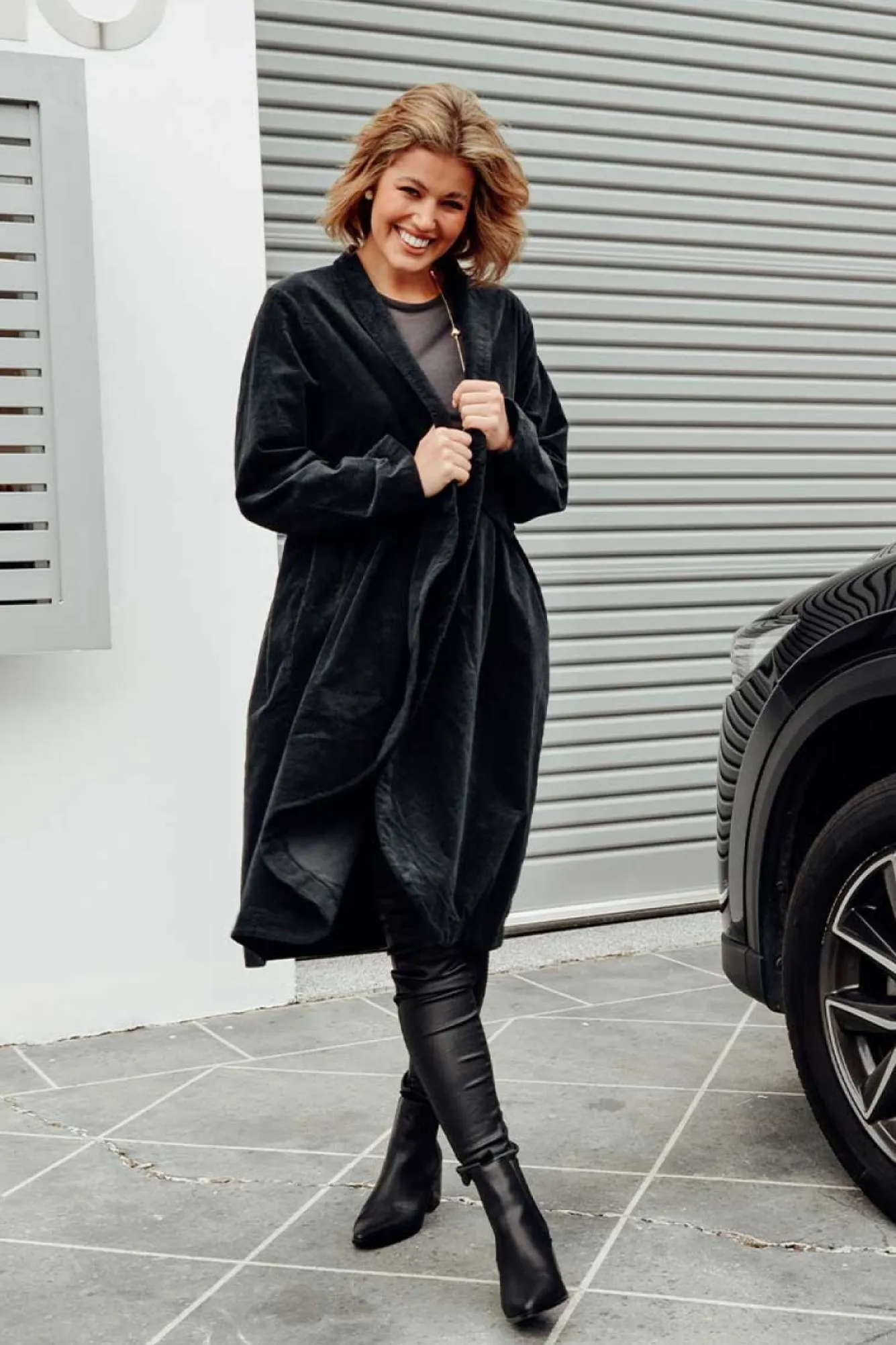 Fit: One Size. Refer To Size & Fit Tab Below For Specific Size Recommendation NNfabric: 97% Cotton, 3% Spandex Nlight Weight, Structured Velvet Feel Fabric With A Small Amount Of StretchNfold Over Full Length CollarNlong SleevesNfaux Pocket Flaps On The Waist With Functional Pockets In The Side SeamNgathered Pleats From Waist Adds Volume To The Silhouette Na-Line Silhouette Nbelow Knee LengthNcurved Hem On The Front And Straight Hem On The BackNNcare: Cool Gentle Hand Wash RecommendedNNcolour: Classic Black Shade