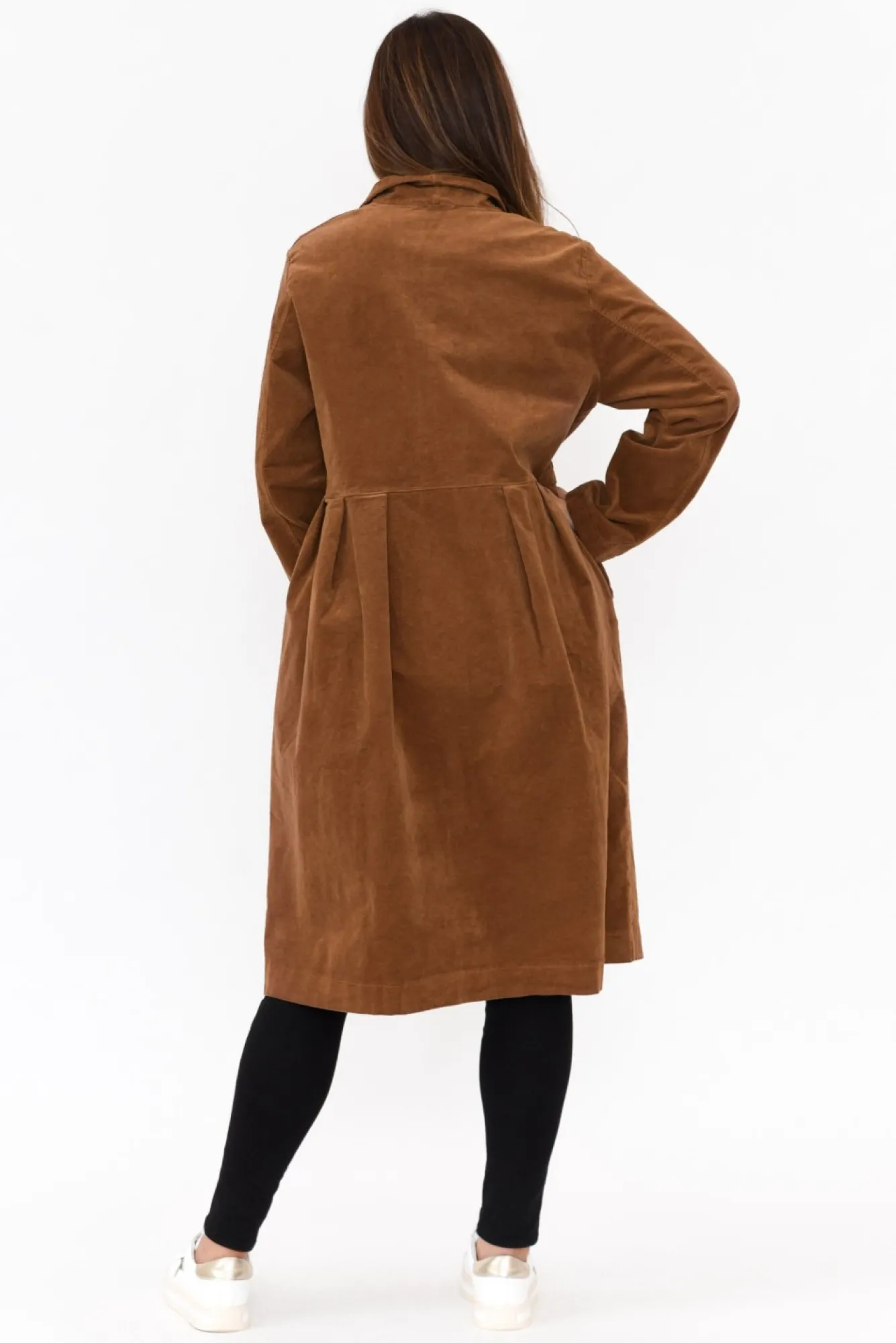 Fit: One Size. Refer To Size & Fit Tab Below For Specific Size Recommendation NNfabric: 97% Cotton, 3% Spandex Nlightweight, Structured Velvet Feel Fabric With A Small Amount Of StretchNfold Over Full-Length CollarNlong SleevesNfaux Pocket Flaps On The Waist With Functional Pockets In The Side SeamNgathered Pleats From The Waist Add Volume To The Silhouette Na-Line Silhouette Nbelow Knee LengthNcurved Hem On The Front And Straight Hem On The BackNNcare: Cool Gentle Hand Wash RecommendedNNcolour: Warm Brown ShadeNNnote: Please See Photos Rather Than Video For Most Accurate Colour