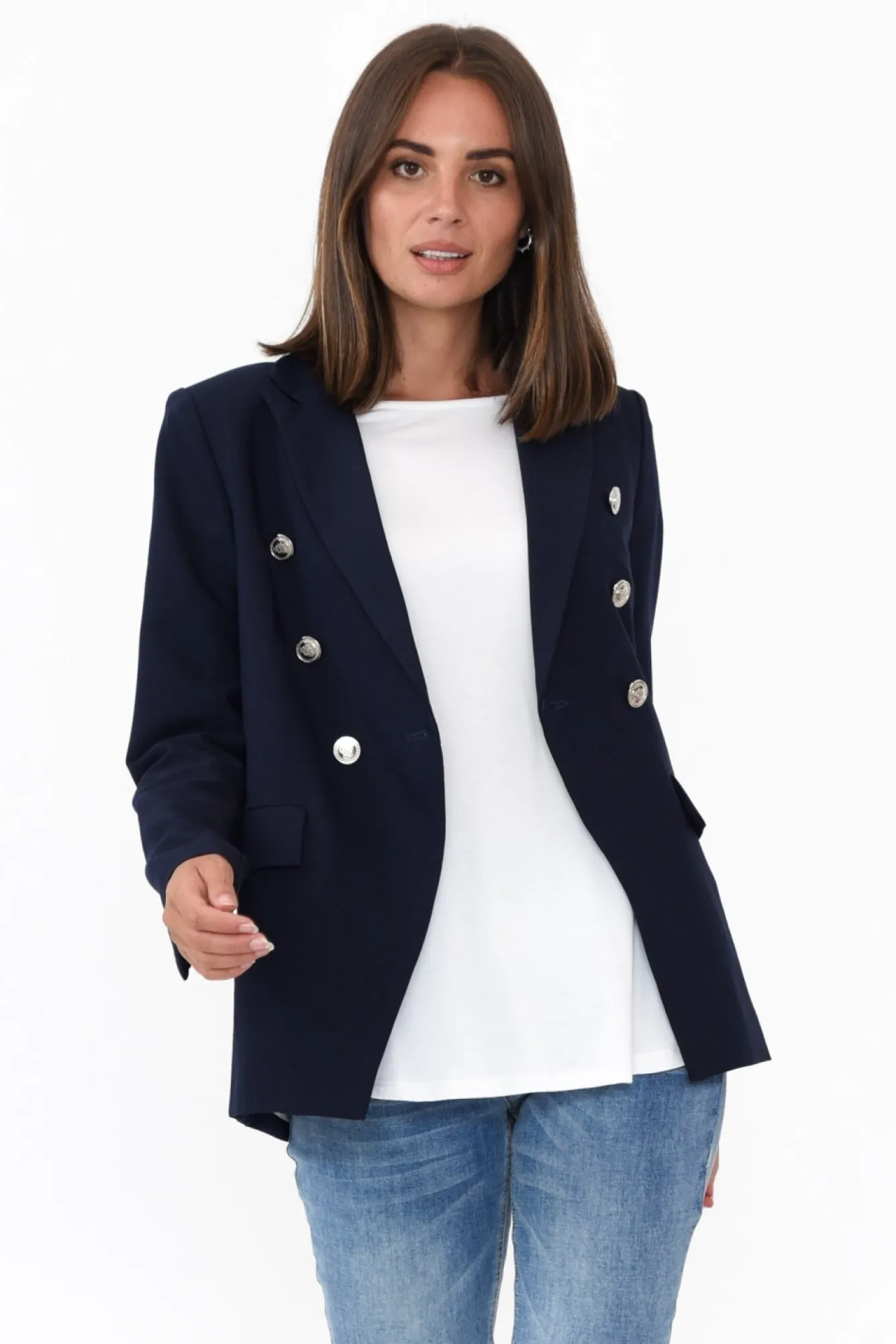 Fit: True To Size. Refer To Size & Fit Tab Below For Specific Size RecommendationNNfabric: Main: 78% Polyester, 18% Viscose, 4% Elastane, Lining: 100% ViscoseNclassic Midweight Blazer With A Silky Feel Lining NNcollared Neckline With Notched LapelsNshoulder Pads Create Shapes And Elevate The LookNdouble-Breasted Style Featuring Embossed Silver ButtonsNtwo Functional Front PocketsNfull-Length Straight SleevesNstructured And Slightly Boxy Silhouette Falls Below The HipsNNcare: Cool Gentle Hand Wash RecommendedNNcolour: Classic French Navy Shade