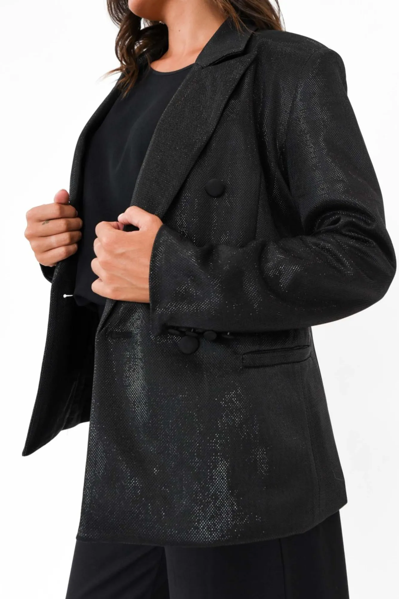 Fit: True To Size. Refer To Size & Fit Tab Below For Specific Size Recommendation NNfabric: 100% PolyesterNa Classic Blazer With A Sparkly Twist Made From Lightweight, Non-Stretch Fabric With Silky-Smooth Lining Ncollared Neckline With Notched LapelsNfull-Length Sleeves With Fixed Button Detailing At The Cuffs NNclassic Double-Breasted Blazer Silhouette Ntwo Faux Front Pockets NNstraight Hemline Falls To Hip-Length NNNcare: Cool Gentle Hand Wash RecommendedNNcolour: Fabulous Metallic Black NNnote: Please See Photos Rather Than Video For Most Accurate Colour