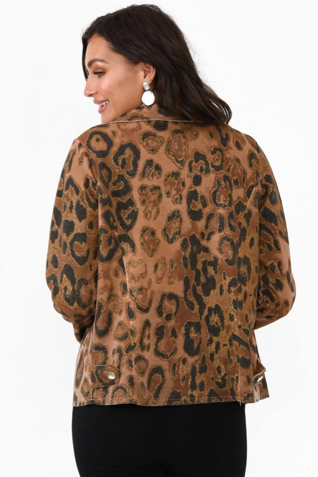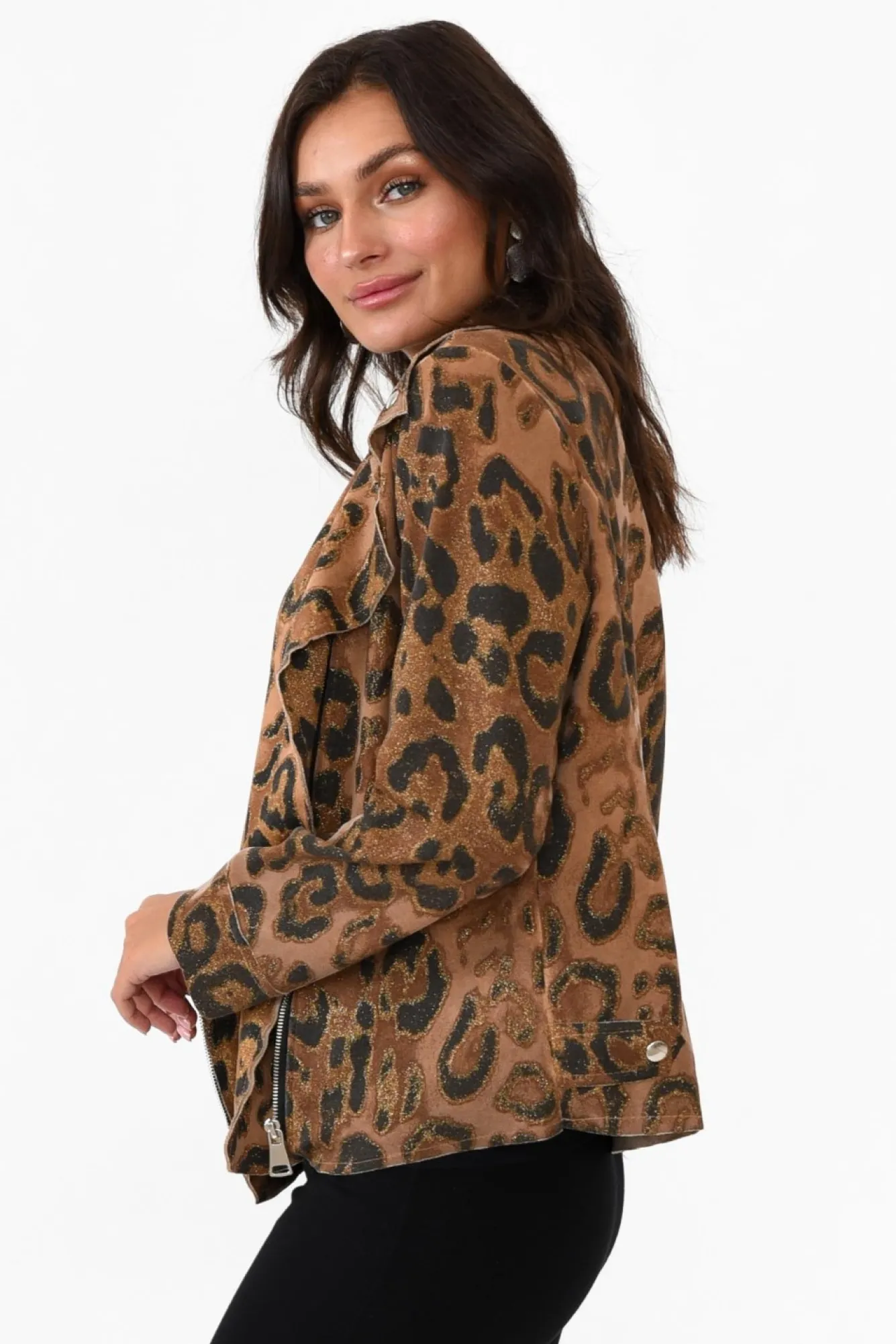 Fit: True To Size. Refer To Size & Fit Tab Below For Specific Size RecommendationNNfabric: 80% Cotton, 20% PolyesterNcrafted In Italy From Midweight, Slightly Stretchy Cotton Blend Fabric Designed With A Soft Velvety Lining Nglittery Leopard Print Design For A Head-Turning Look Nfull-Length Sleeves With Raw EdgeNNfabulous Biker-Style Design Enhanced By Feature Lapel Detailing And Zip Front Nfixed Tab Detail With Faux Snap Button Featured At The Back Near Hips NNstraight Hem Falls Above Hip Length NNNcare: Cool Gentle Hand Wash RecommendedNNcolour: Brown Leopard Print With Hints Of Gold Glitter Throughout