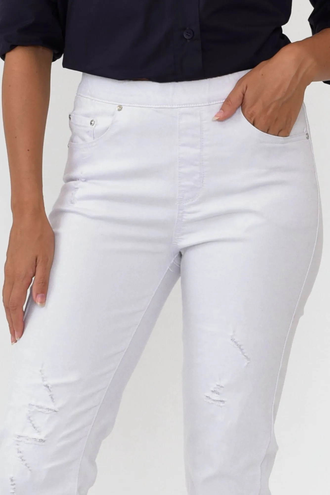Fit: True. Refer To Size & Fit Tab Below For Specific Size RecommendationNNfabric: 78% Cotton, 20% Polyester, 2% ElastaneNa Comfortable And Casual Stretch Denim StyleNslightly Sheer Fabric, We Recommend Wearing Nude UndergarmentsNhigh-Rise – The Dream Fit For Covering Lumps And BumpsNultra-Comfortable Flat And Super-Stretch Elastic WaistbandNfaux Fly Created With StitchingNfive Functional Pockets – 2 Front Hip Pockets, 1 Front Coin Pocket, 2 Back PocketsNNdistressed Details With White Backing, Perfectly Creates A Trendy Look Without Sacrificing Comfort! N7/8 Length – Roll The Cuffs For An On-Trend Cropped LengthNNcare: Cool Gentle Machine Wash RecommendedNNcolour: Bright White Shade