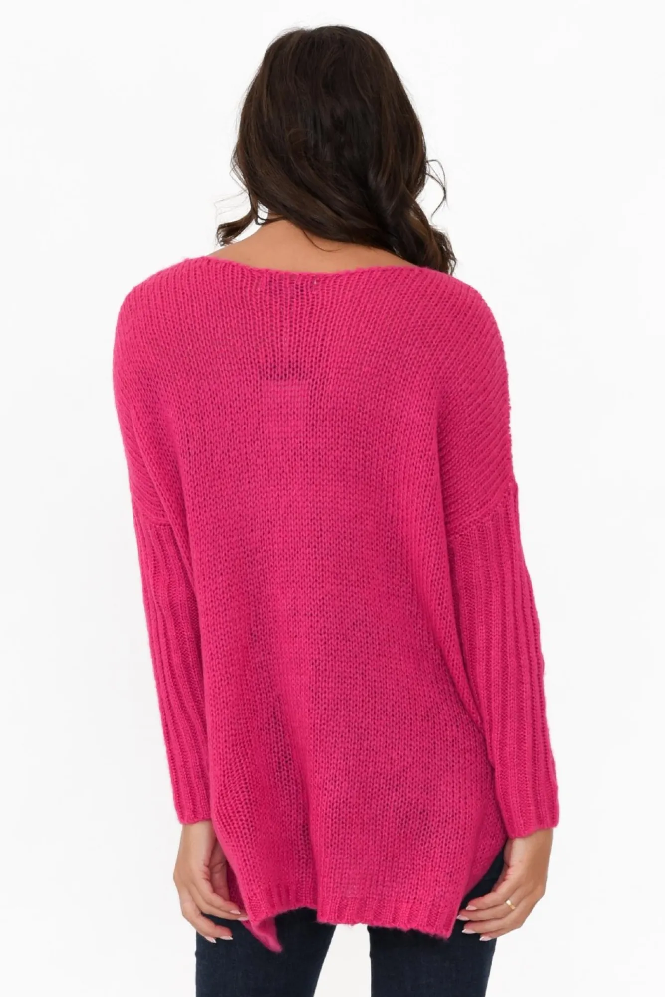 Fit: True To Size. Refer To Size & Fit Tab Below For Specific Size RecommendationNNfabric: 75% Acrylic, 25% PolyesterNmidweight And Fluffy Knitted Jumper With A Lovely Loose WeaveNstraight Boat Neckline Sits At The Base Of The NeckNNfeature Cable Knit Detailing Down The Front Centre NNribbed Knit 7/8 Length Sleeves With A Soft Drop ShoulderNstraight-Cut Hi-Lo Hemline Accentuates The Boxy SilhouetteNNjumper Falls To A Below-Hip Length NNcare: Cool Gentle Hand Wash RecommendedNNcolour: Eye-Catching Hot Pink Shade