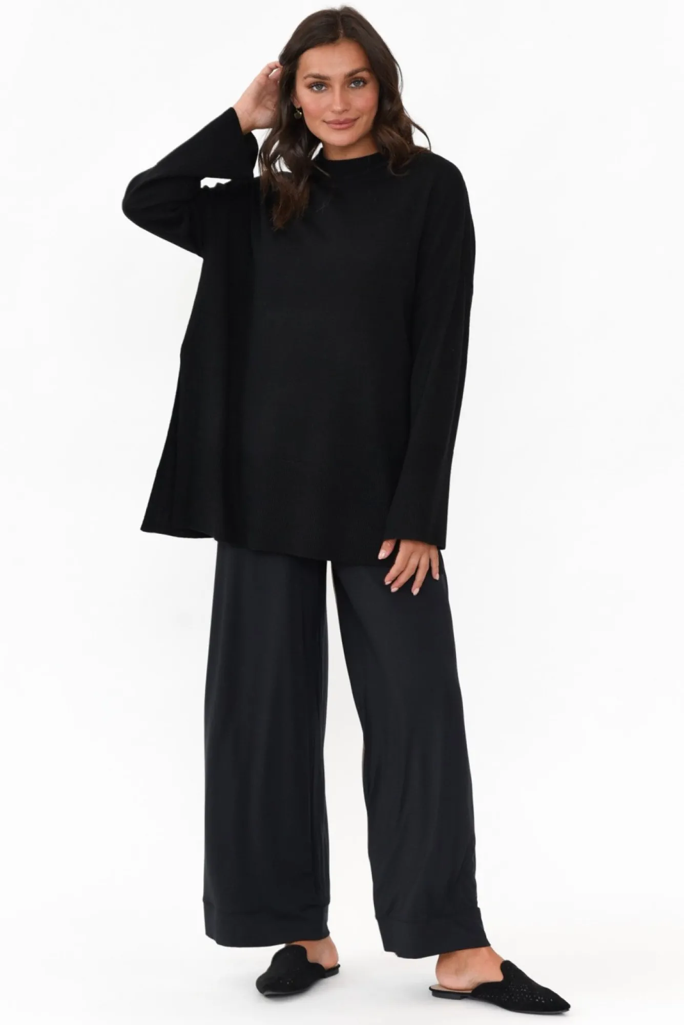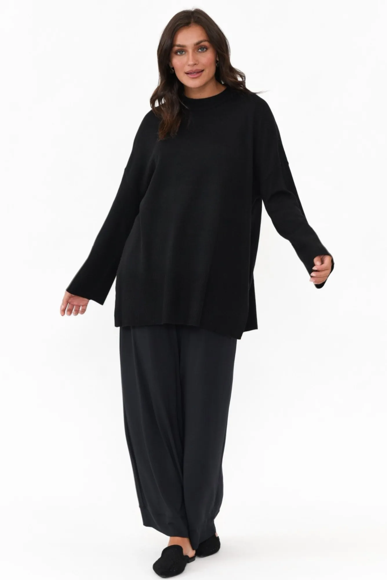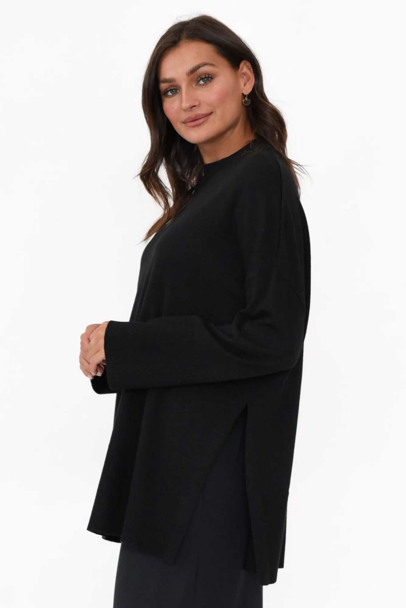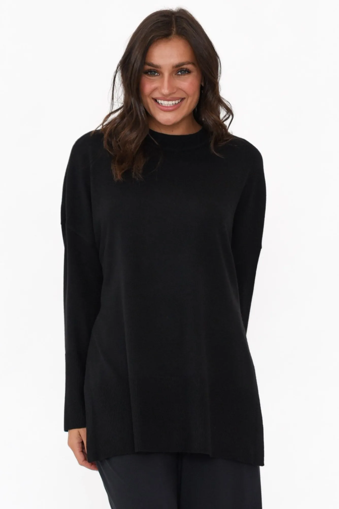 Fit: True To Size. Refer To Size & Fit Tab Below For Specific Size RecommendationNNfabric: 47% Polyester, 33% Wool, 20% Acrylic Ncrafted From Midweight, Cosy And Smooth Wool Blend Fabric With Soft Knitted Hand Feel Nhigh Round Neckline Finished With Ribbed Detailing NNstraight Wide Full-Length SleevesNexaggerated Ribbed Detailing On Cuffs And Hemline NNtimeless Straight Silhouette Elevated By 30Cm Side Splits Nhem Falls Below Hip Length NNNcare: Cool Gentle Hand Wash RecommendedNNcolour: Midnight Black