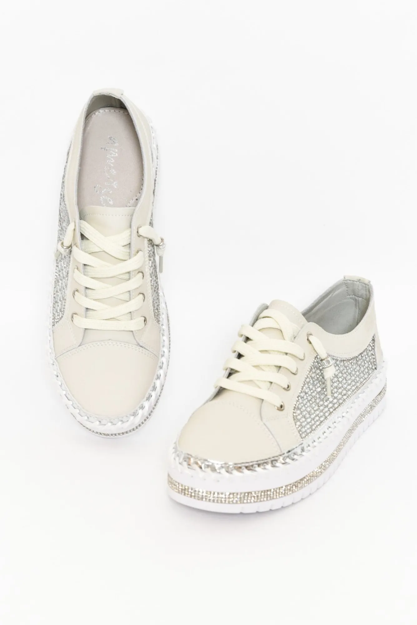 True To Size: Pick The Size You Would Normally BuyNNfit: Standard – WideNdazzling Platform Sneakers Crafted From Premium Leather And Adorned With Sparkling Embellishments!Nslip-On Design – Laces Are Secured With A Faux Crystal Eyelet For An Open Lace DesignNhidden Elastic Panels Under The Tongue To Prevent Shifting Npanelled Design Of Diamantes And Faux Crystals Adorn The Side Of The ShoeNstrip Of Diamantes On The Base Of The Shoe And Thick Exposed Stitching Details Ties The Whole Look Together Ncomfy Padded InsoleNgrooved Tread Sole Enhances Flexibility And GripNNNupper: Leather NNlining: Man-MadeNsole: Man-MadeNheel Height: 3.3CmNshoe Care: Use A Water And Stain Repellent Spray To Protect Before Wearing. To Clean Use A Damp Cloth And Spot Clean.