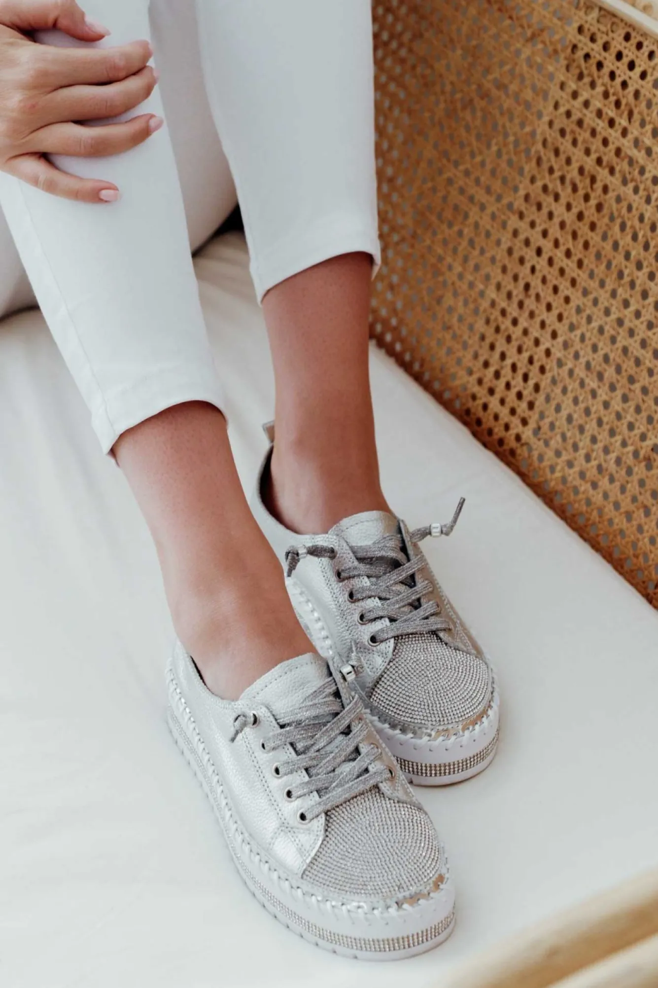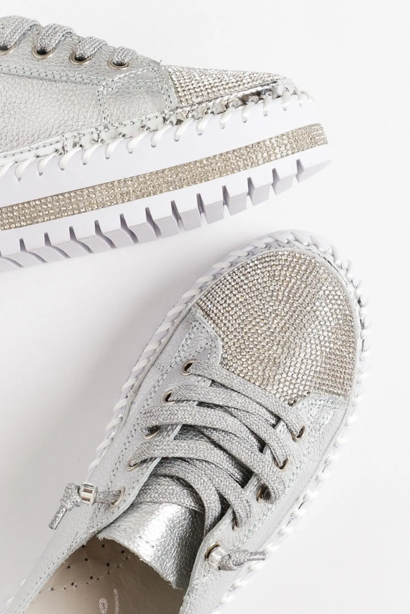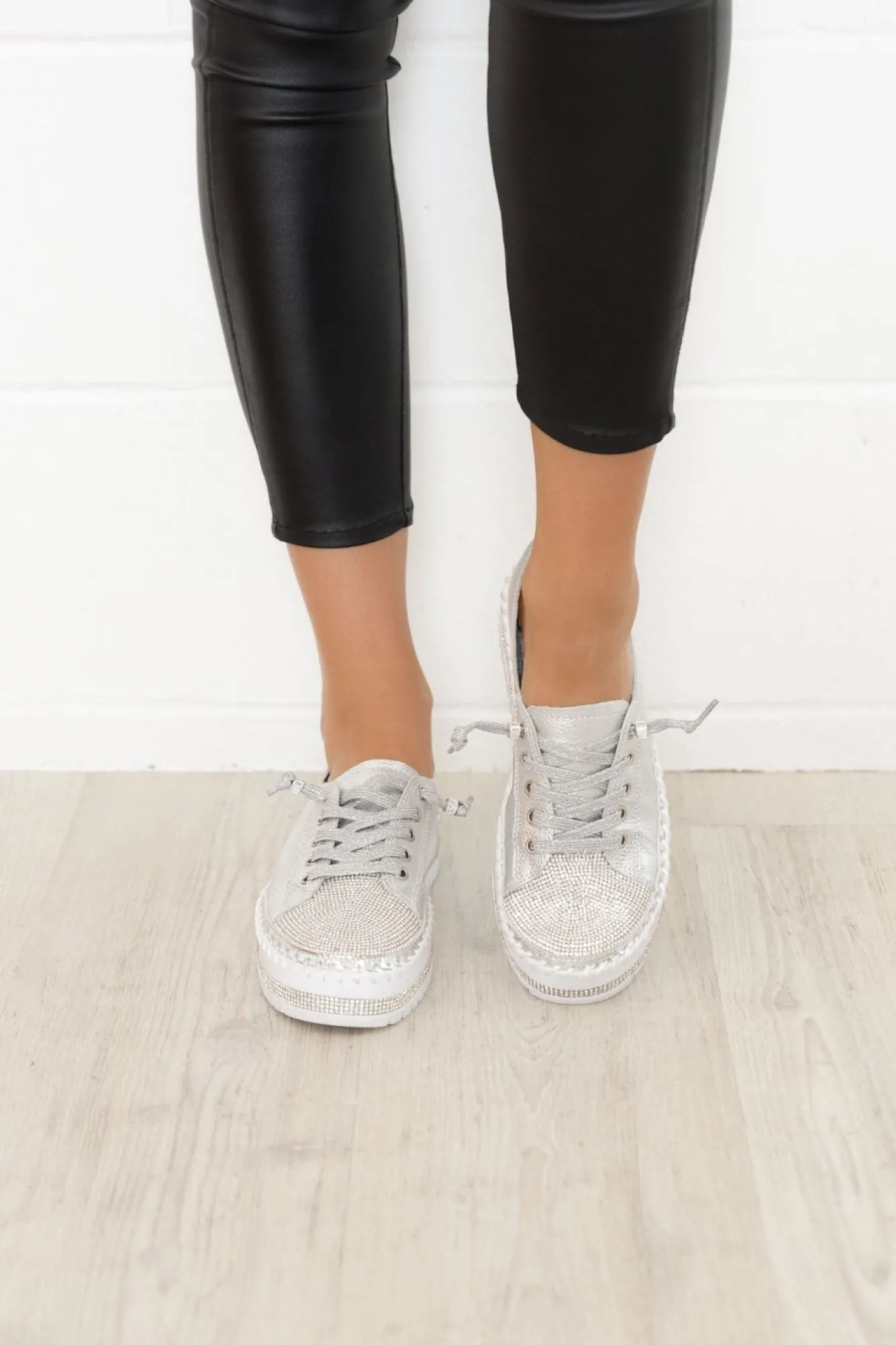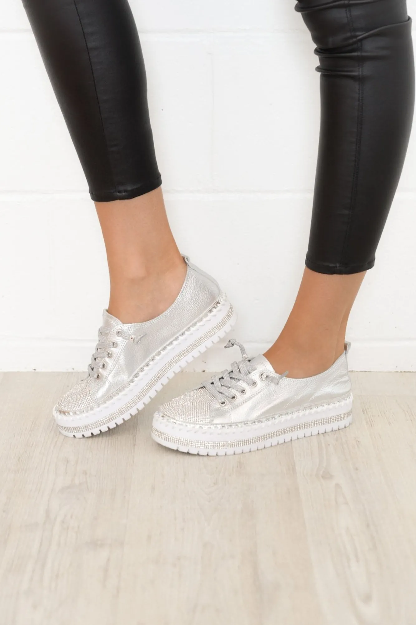Runs Slightly Small: If In Between Sizes, We Recommend Sizing UpNNfit: Standard – Wide.Nplatform Sneaker Design With Some Dazzle!Nsparkly Silver Laces With Silver EyeletsNno Need To Do Up The Laces, They Are Reinforced With A Bead For An Open Lace Design!Nthick Cushioned Inner SoleNstrip Of Diamantes On The Base Of The Shoe, A Strip Of Metallic Silver And Thick Exposed Stitching Detailing For An Extra Stylish TouchNsilver Base With A Silver Diamante Panel On The Front Toe AreaNchunky Platform Heel With Grooved Tread Enhancing Flexibility And GripNincludes A Small Bag Of Replacement Sequins To Keep Your Shoes Shining Bright! Nupper: LeatherNNlining: LeatherNsole: Man MadeNNheel Height: 3CmNN Product Care: Spot Clean Only. Use A Damp Cotton Wool Swab Stick To Clean The Affected Areas. Dry Afterwards.