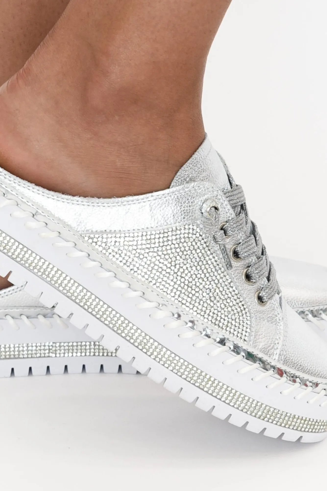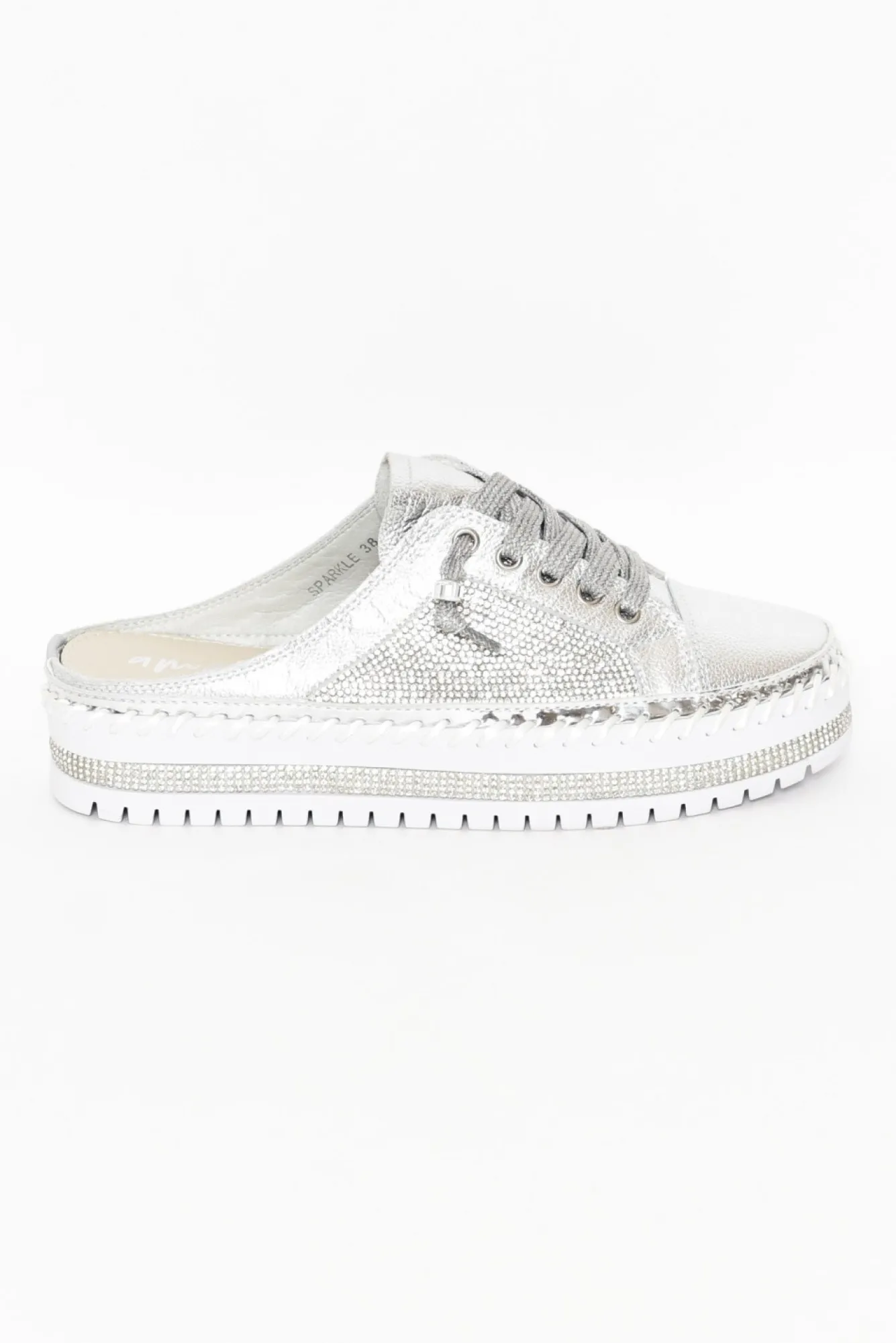 True To Size: Pick The Size You Would Normally Buy NN Fit: Standard – Wide Nput Some Sparkle In Your Step With This Bedazzled Platform MuleNshimmering Silver Laces With Silver Beaded AgletNno Need To Do Up The Laces, They Are Reinforced With A Bead For An Open Lace Design!Nthick Cushioned Inner SoleNstrip Of Diamantes On The Base Of The Shoe And Thick Exposed Stitching Detailing For An Extra Stylish TouchNsilver Leather Upper With Feature Silver Rhinestone PanelsNNchunky Platform Heel With Grooved Tread Enhancing Flexibility And GripNincludes A Small Bag Of Replacement Sequins To Keep Your Shoes Shining Bright! NNupper: LeatherNNlining: SyntheticNsole: Synthetic Nheel Height: 3.2Cm Nshoe Care: Use A Water And Stain Repellent To Protect Before Wearing. Clean With A Damp Cloth And Polish Afterwards.