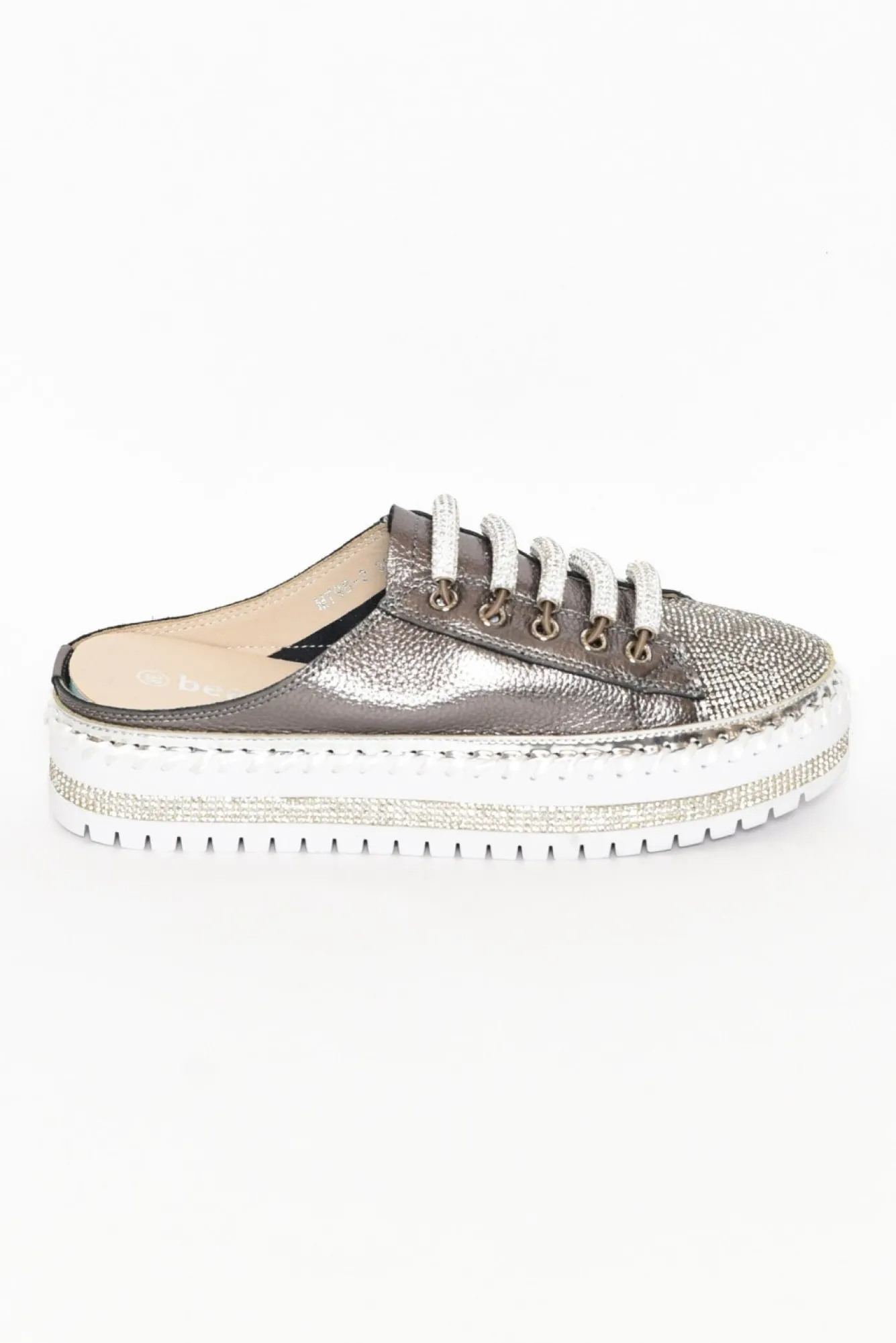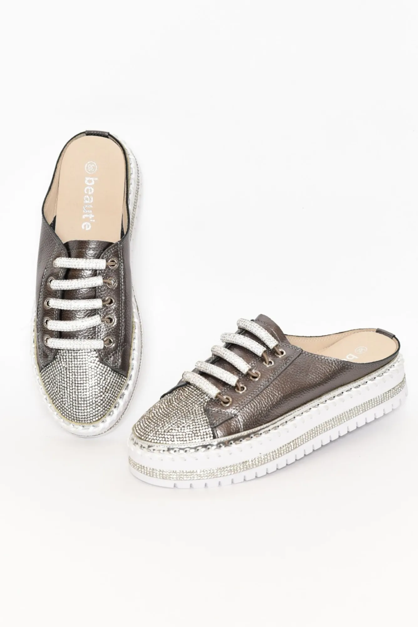 True To Size: Pick The Size You Would Normally Buy NN Fit: Standard – Wide NNstand Out In These Bedazzled Sneaker Mules!NNcrafted From Genuine, Soft Leather For All-Day Comfort Nelastic Gusset Under The Tongue For Easy Slip-OnNstretch Laces Enclosed In A White Bedazzled Casing For An Extra Touch Of BlingNstrip Of Diamantes On The Base Of The Shoe And Thick Exposed Stitching DetailsNchunky Platform Heel With Grooved Tread Provides Non-Slip StabilityNmetallic Charcoal Upper With A Diamante Adorned Toe BoxNNthick Cushioned Inner SoleNNupper: LeatherNNlining: LeatherNsole: SyntheticNheel Height: 3.5Cm Nshoe Care: Spot Clean Only. Use A Damp Cotton Wool Swab Stick To Clean The Affected Areas. Dry Afterwards.Nnote: Please See Photos Rather Than Video For Most Accurate Colour.
