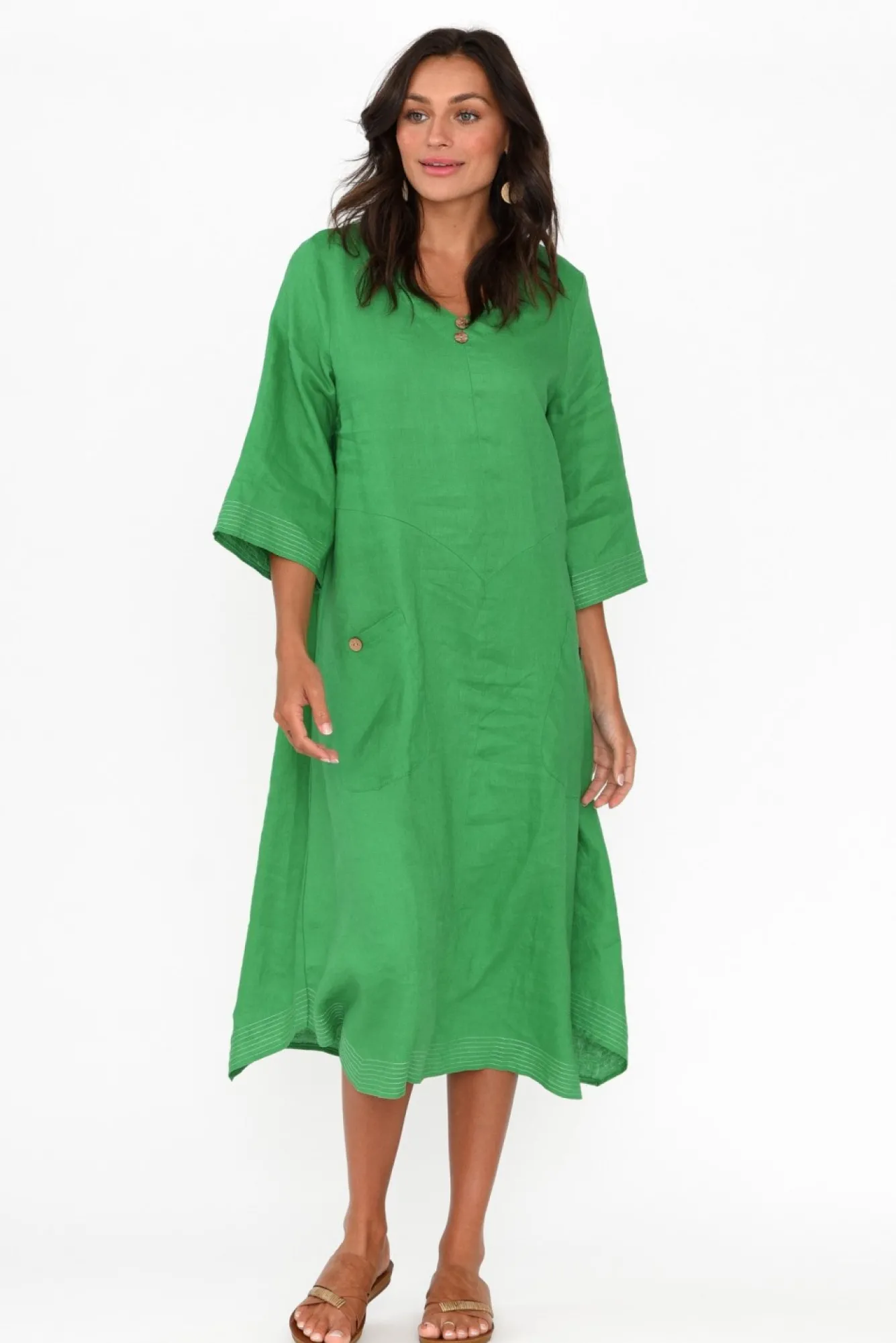 Fit: True To Size. Refer To Size & Fit Tab Below For Specific Size RecommendationNNfabric: 100% LinenNcrafted From Woven Linen Fabric, Offering Wonderful Breathability And A Non-Stretch Finish Nfeature V-Neckline With Fixed Wooden Button Detail At The BaseNN3/4 Length Sleeves For A Transeasonal Look Nwhite Contrast Stitching Creates An Elevated Feel NNa-Line Silhouette With Two Front Pockets Both With A Fixed Wooden Button Detail Nrounded Hem Falls To Midi Length NNNcare: Cool Gentle Machine Wash RecommendedNNcolour: Gorgeous Emerald With White Contrast Stitching