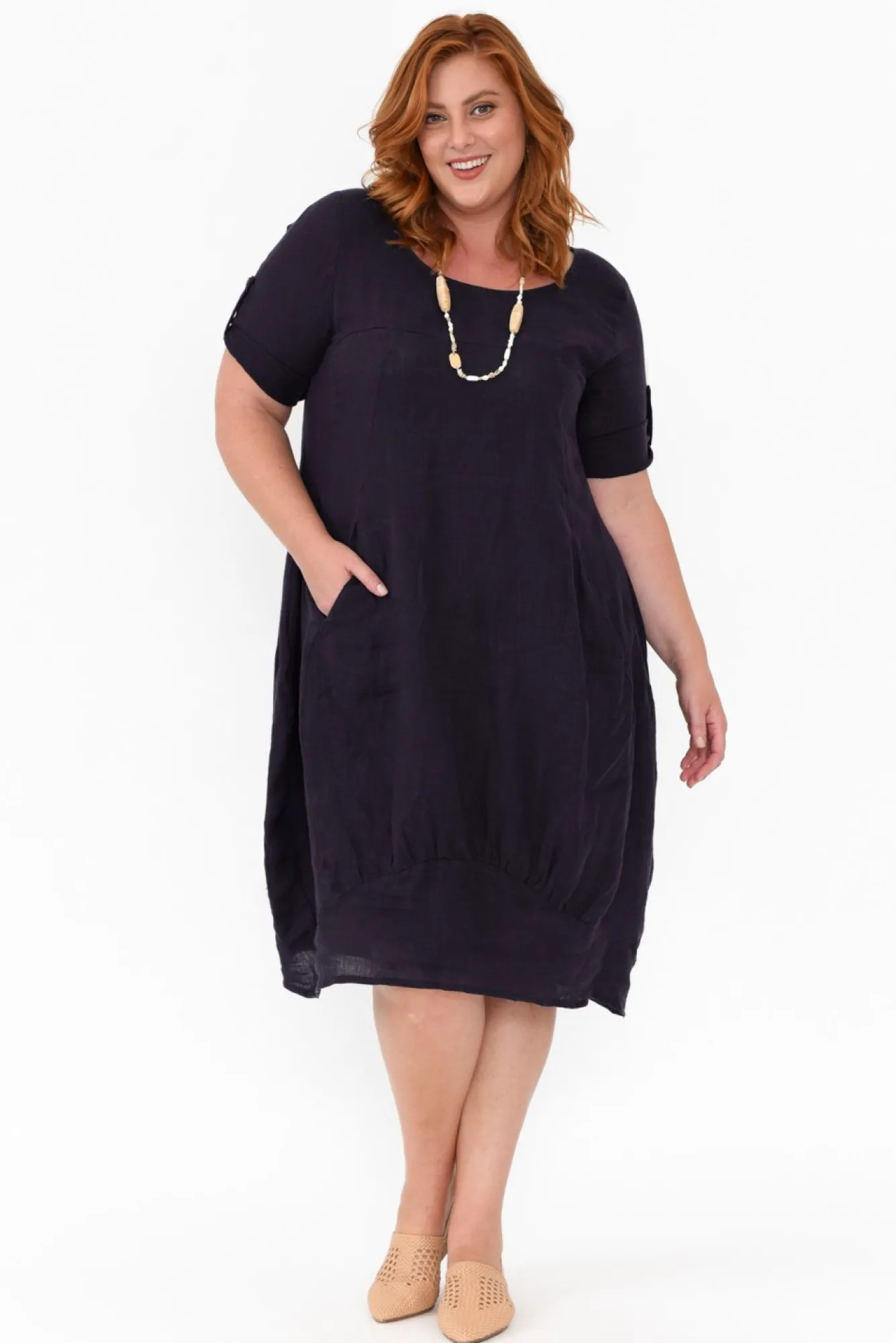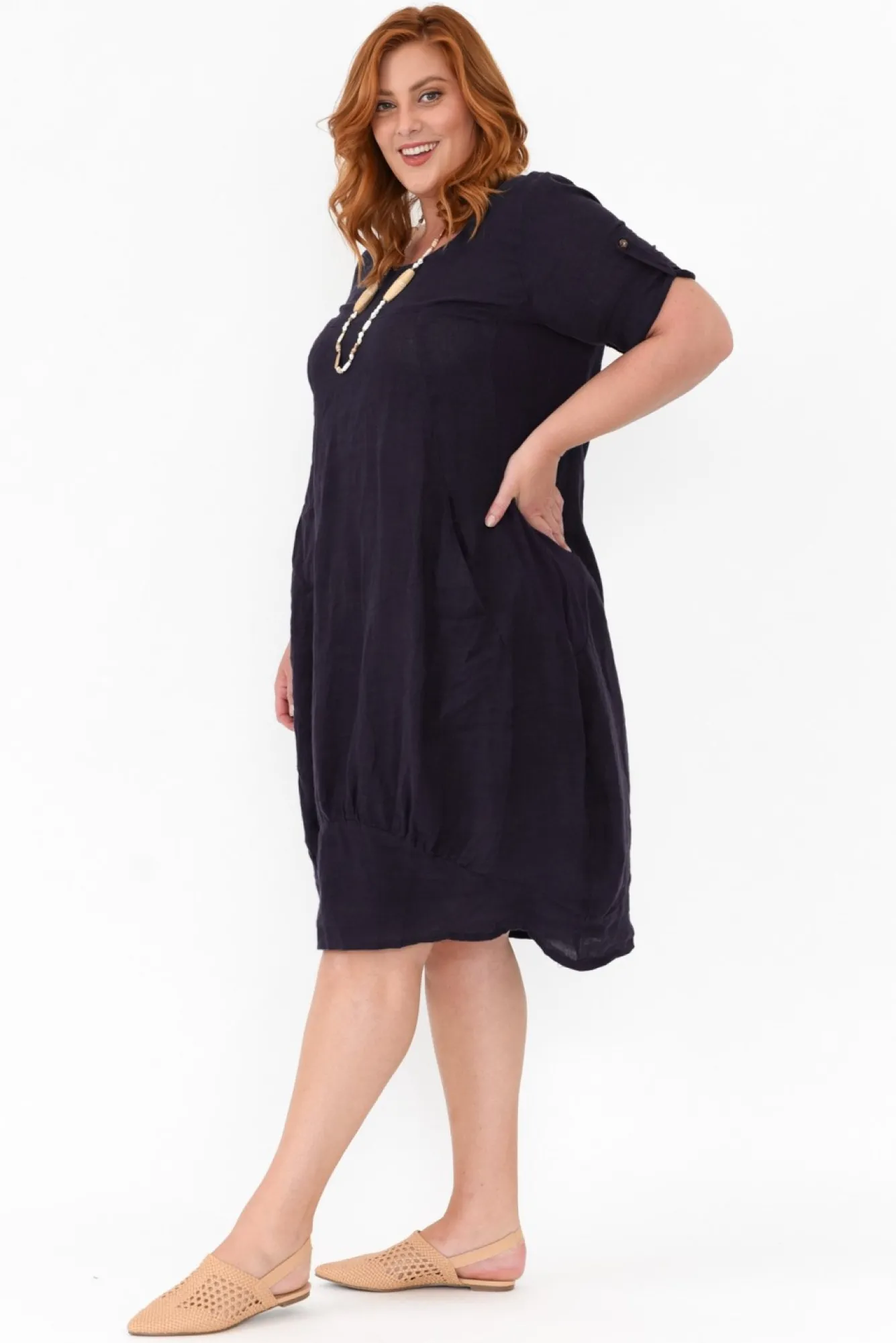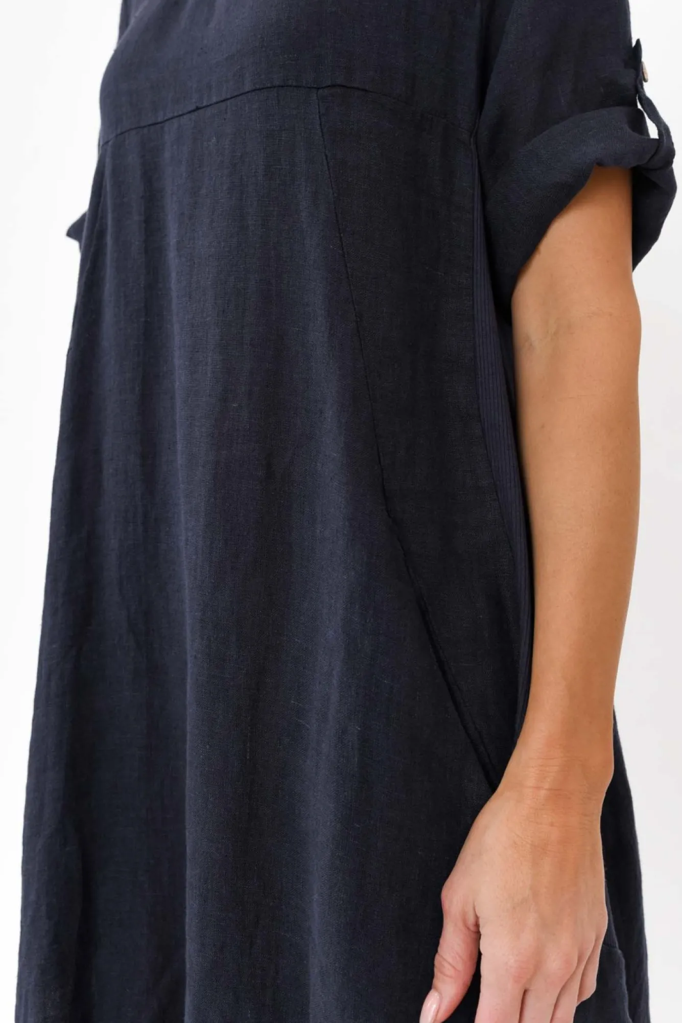 Fit: True. Refer To Size & Fit Tab Below For Specific Size RecommendationNNfabric: 100% LinenNa Luxuriously Lightweight And Breathable Linen DressNNwide Neckline Highlights The CollarbonesNN3/4 Length Sleeves With Ability To Roll Cuff And Fasten With A Button And TagNNflattering Balloon Silhouette Accentuates CurvesNNtwo Pockets Features At The Front Of TorsoNNultra Stretchy And Comfortable Ribbed Side PanellingNcurved, Tapered Hemline Detailing With Feminine DrapeNNmidi Length GarmentNNcare: Cool Gentle Machine Wash RecommendedNNcolour: Deep Navy Tone