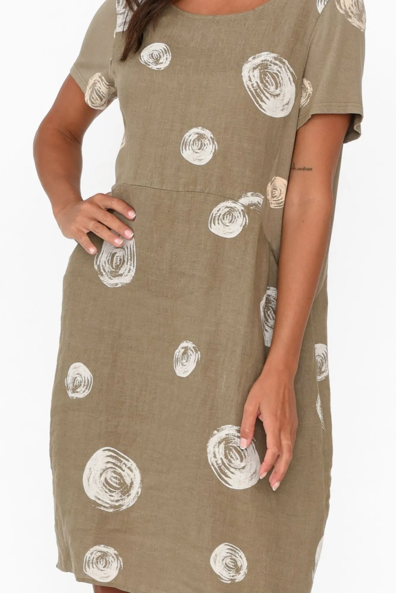 Fit: True To Size. Refer To Size & Fit Tab Below For Specific Size RecommendationNNfabric: Main: 100% Linen Side Panels: 92% Cotton, 8% ElastaneNNlovely Lightweight And Breathable Linen Main, With Ultra-Soft And Stretchy Side PanelsNstretchy Ribbed Cotton-Blend Panels Running From The Sleeves Down To The Hip Are Both Fashionable And FunctionalNrounded Neckline Sits Below The CollarbonesNshort T-Shirt Style SleevesNNtwo Feature Side Hip PocketsNNflattering Balloon Silhouette Flows Over CurvesNstraight Hemline Falls To The KneeNNcare: Cool Gentle Hand Wash RecommendedNNcolour: Versatile Khaki With An Oversized Spot Overlay
