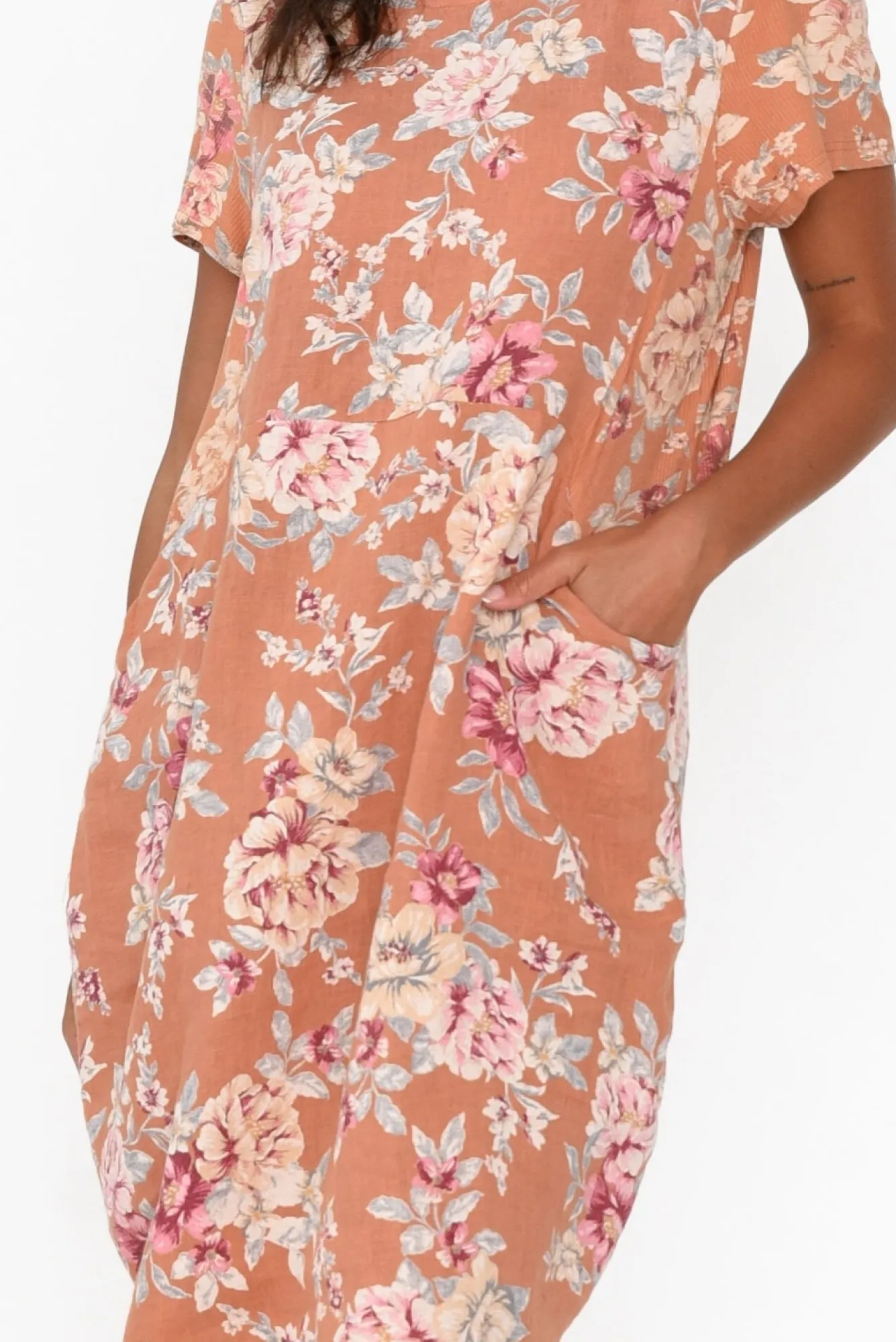 Fit: True To Size. Refer To Size & Fit Tab Below For Specific Size RecommendationNNfabric: Main: 100% Linen Side Panels: 92% Cotton, 8% ElastaneNNlovely Lightweight And Breathable Linen Main, With Ultra-Soft And Stretchy Side PanelsNstretchy Ribbed Cotton-Blend Panels Running From The Sleeves Down To The Hip Are Both Fashionable And FunctionalNrounded Neckline Sits Below The CollarbonesNshort T-Shirt Style SleevesNNtwo Feature Side Hip PocketsNNflattering Balloon Silhouette Flows Over CurvesNstraight Hemline Falls To The KneeNNcare: Cool Gentle Hand Wash RecommendedNNcolour: Deep Orange Base With A Delicate Pink Floral Overlay