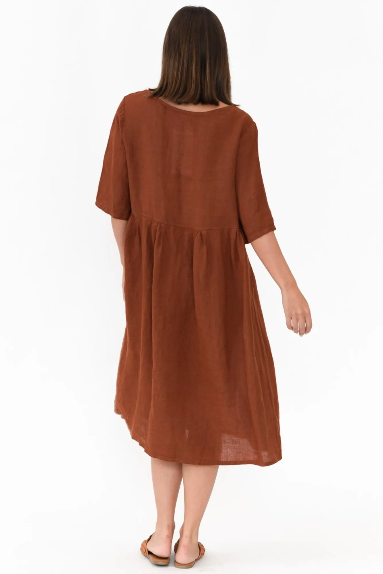 Fit: True To Size. Refer To Size & Fit Tab Below For Specific Size RecommendationNNfabric: 100% LinenNluxurious Lightweight And Breathable Italian LinenNNclassic Round Neckline And Half Length SleeveNtiered A-Line Silhouette Flatters CurvesNNtwo Hip PocketsNNstraight Hemline Falls Just Below The KneesNNcare: Cool Gentle Hand Wash RecommendedNNcolour: Deep Rust Brown Shade
