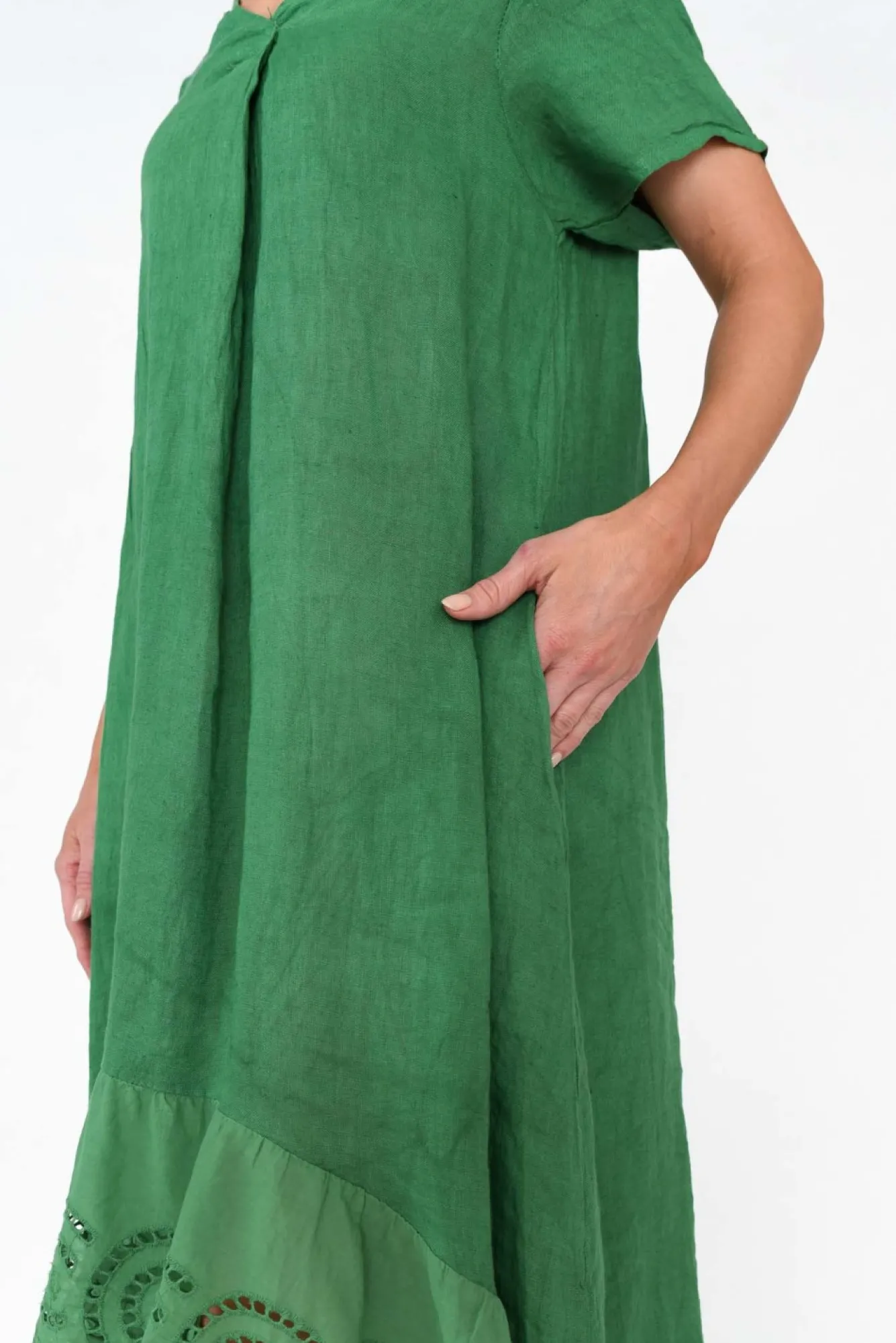 Fit: True To Size. Refer To Size & Fit Tab Below For Specific Size RecommendationNNfabric: 100% LinenNcrafted In Italy From Ultra-Lightweight, Breathable And Non-Stretch Linen Designed With A Signature Woven Hand Feel NNfabric Is Semi Sheer, We Recommend Pairing With A Slip Or Nude Undergarments Nstriking V-Neckline Accentuated By A Feature Pleat Detail NNversatile Straight Short Sleeves NNbreezy A-Line Silhouette Flares Towards The Hemline NNtwo Discreet Hip Pockets NNbroderie Anglaise Hi-Lo Hemline Falls To Midi Length NNNcare: Cool Gentle Machine Wash RecommendedNNcolour: Gorgeous Emerald Hue