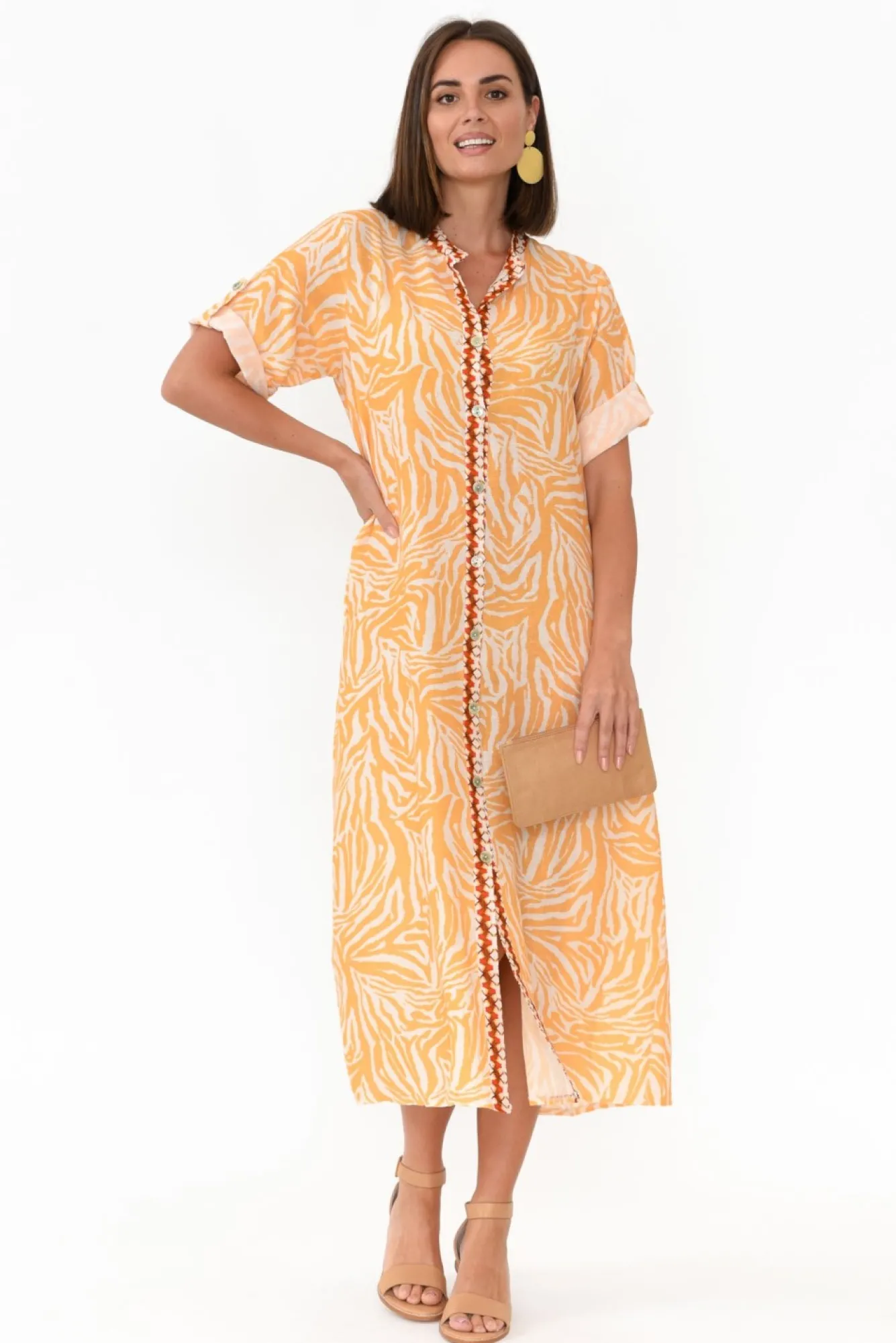 Fit: True To Size. Refer To Size & Fit Tab Below For Specific Size Recommendation NNfabric: 70% Linen 30% CottonNa Fabulous And Vibrant Shirt Dress Crafted In Italy From Lightweight, Breathable And Non-Stretch Linen With A Lovely Soft Slub FeelNNclassic Banded Collar NecklineNNornately Printed Collar And Placket With Pearlescent Buttons From Bust To Base N3/4 Length Sleeves Can Be Cuffed And Secured With Feature ButtonsNflattering Straight Cut Shirt Silhouette NNtwo Discreet Hip Pockets NNstraight Hemline Falls To Midi LengthNNNcare: Cool Gentle Machine Wash RecommendedNNcolour: Cream White Base With Tangerine Zebra Print