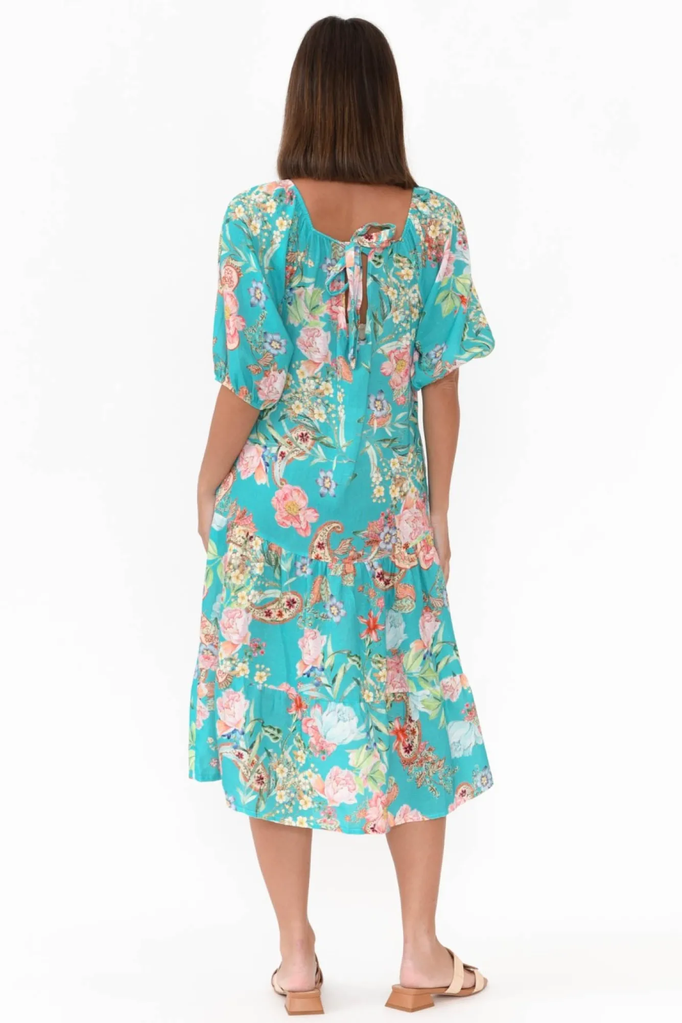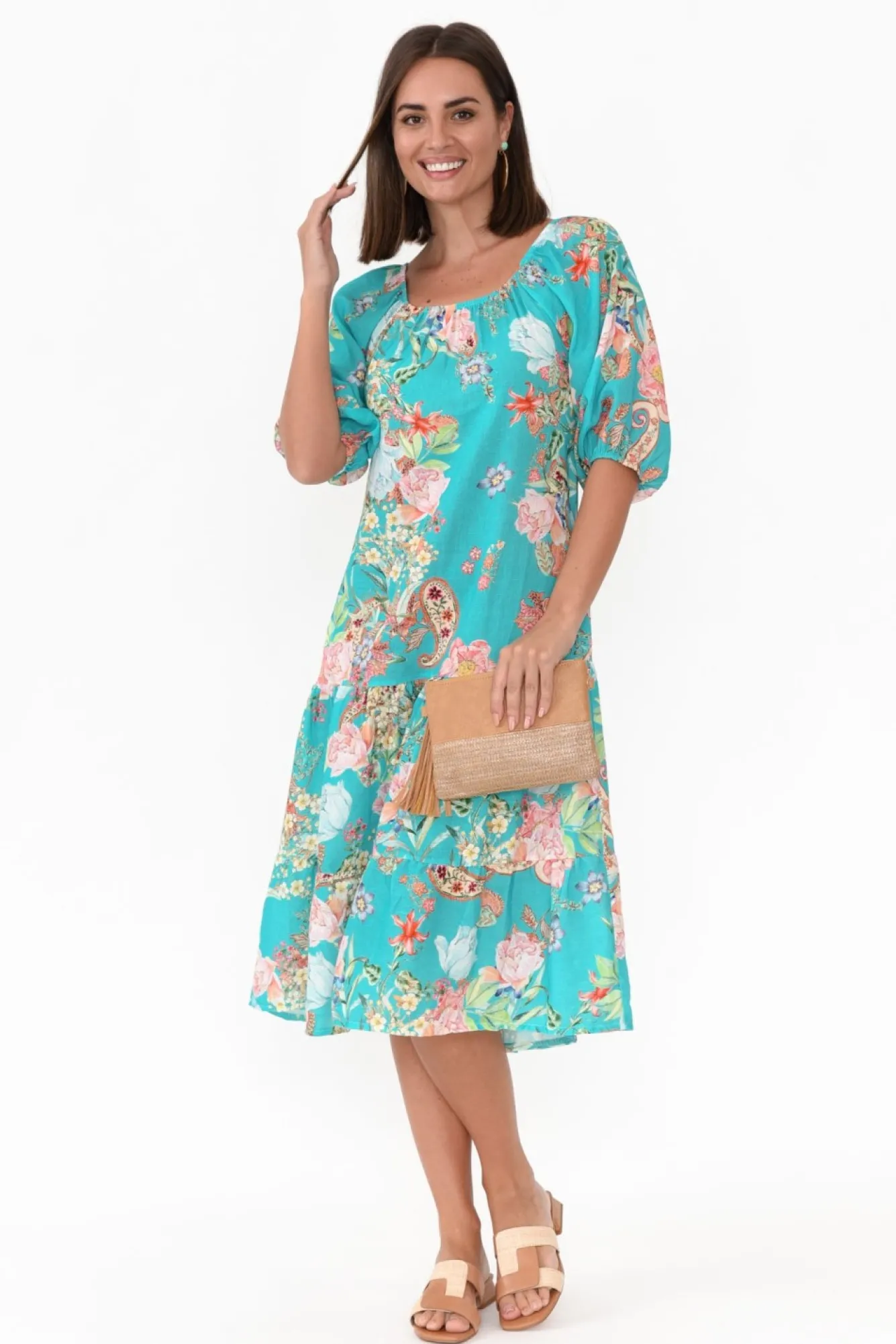 Fit: True To Size. Refer To Size & Fit Tab Below For Specific Size Recommendation NNfabric: 70% Linen 30% CottonNstay Vibrant And Chic In This Gorgeous Tiered Dress Made From Midweight, Breathable And Non-Stretch Fabric With A Soft Slub FeelNelasticated Neckline Can Be Worn On Or Off Shoulder NNfeaturing Stunning Adjustable Tie Detail At The Back N3/4 Length Puff Sleeves With Elasticated Cuff NNflattering A-Line Silhouette With Tiered SkirtNNtwo Discreet Hip Pockets NNstraight Hemline Falls Below Knee Length NNNcare: Cool Gentle Machine Wash RecommendedNNcolour: Ocean Turquoise Base With Tangerine Paisley Print