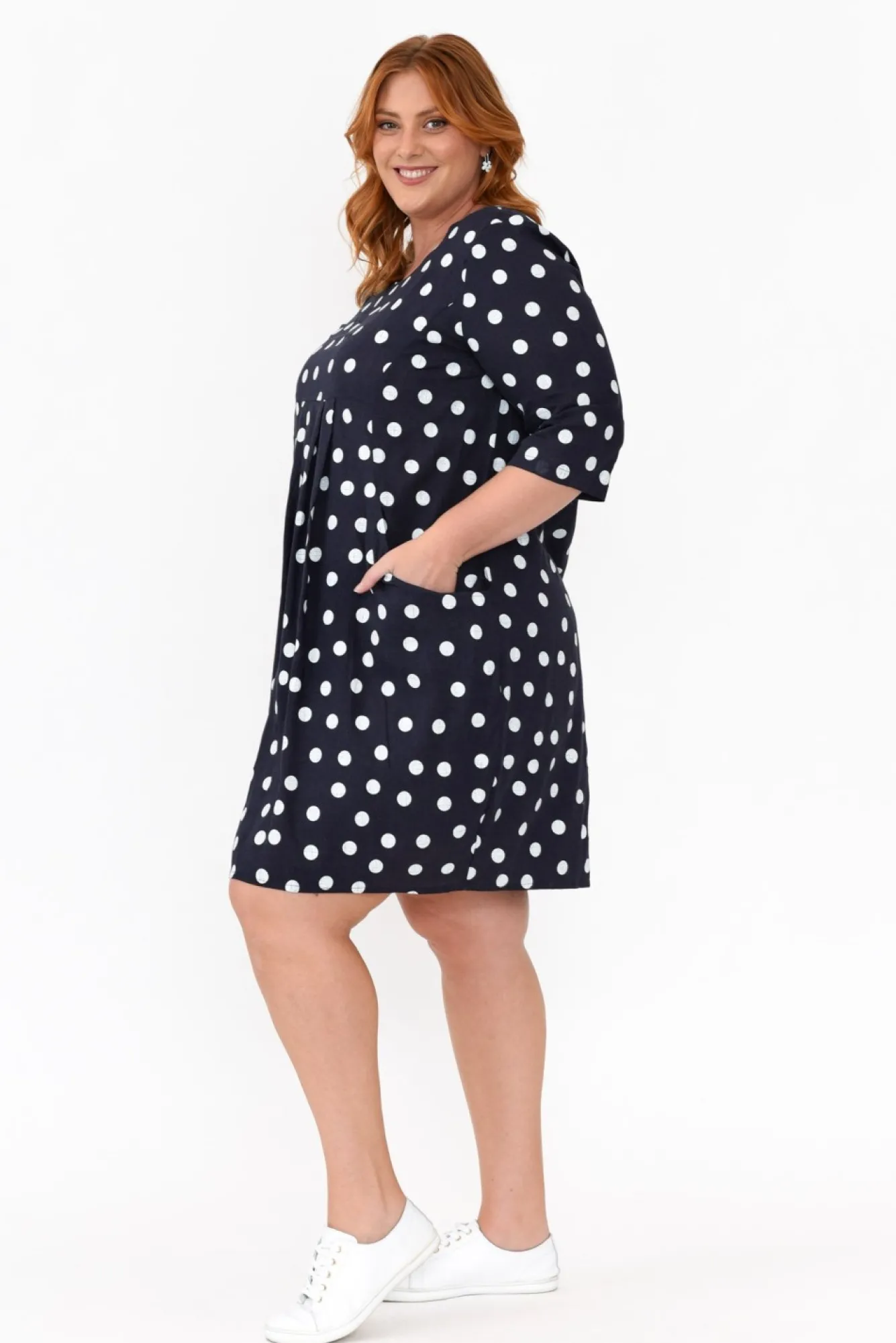 Fit: Relaxed Fit – Recommend Sizing Down. Refer To Size & Fit Tab Below For Specific Size RecommendationNNfabric: 65% Linen, 35% CottonNbreezy Lightweight, Non-Stretch And Breathable Linen Blend Fabric With A Textured Hand Feel NNscoop Neckline Complements The Half-Length Sleeves Nrelaxed Balloon Silhouette With Tapering Near The Hemline NNsoft Pleating Under The Bust Creates An Elevated Look Ntwo Feature Front PocketsNfalls Above Knee Length NNNcare: Cool Gentle Hand Wash RecommendedNNcolour: Classic Navy And White Polka Dot PrintNNnote: Measurements And Fit May Vary Between Colours, Please Check The Appropriate Size Charts