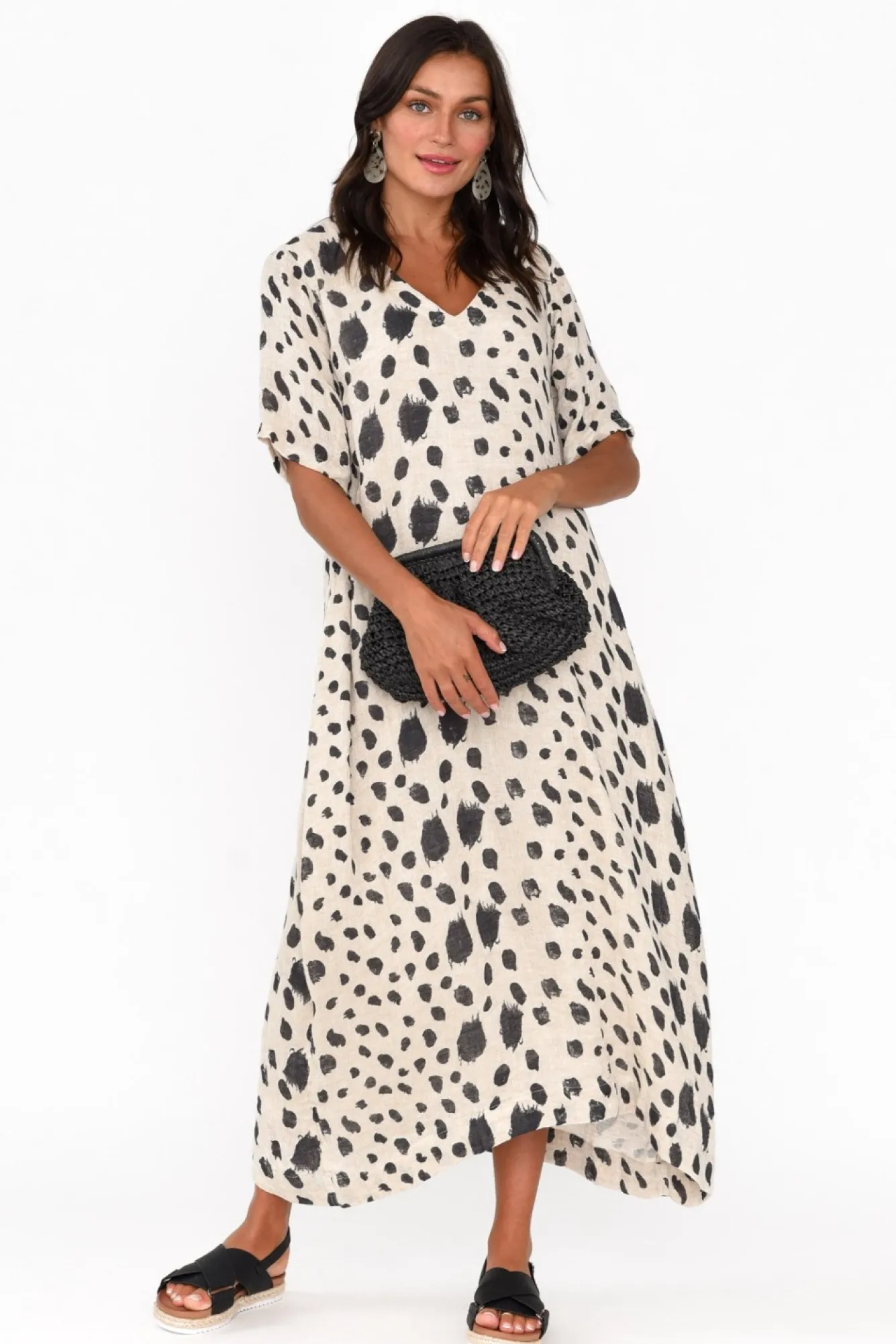 Fit: True To Size. Refer To Size & Fit Tab Below For Specific Size RecommendationNNfabric: 100% LinenNgorgeous Lightweight, Breathable And Non-Stretch Linen Designed With A Loose Woven FinishNNfully Lined From Shoulder To BaseNsoft V-Neckline Flatters The Collarbones NNstraight Half-Length Sleeves NNrelaxed Balloon Silhouette With Subtle Tapering Towards The Hem NNtwo Hip Pockets Located In Side Seams NNstraight Hemline Falls To Midi Length NNNcare: Cool Gentle Hand Wash RecommendedNNcolour: Beige Base With A Black Abstract Spot Print