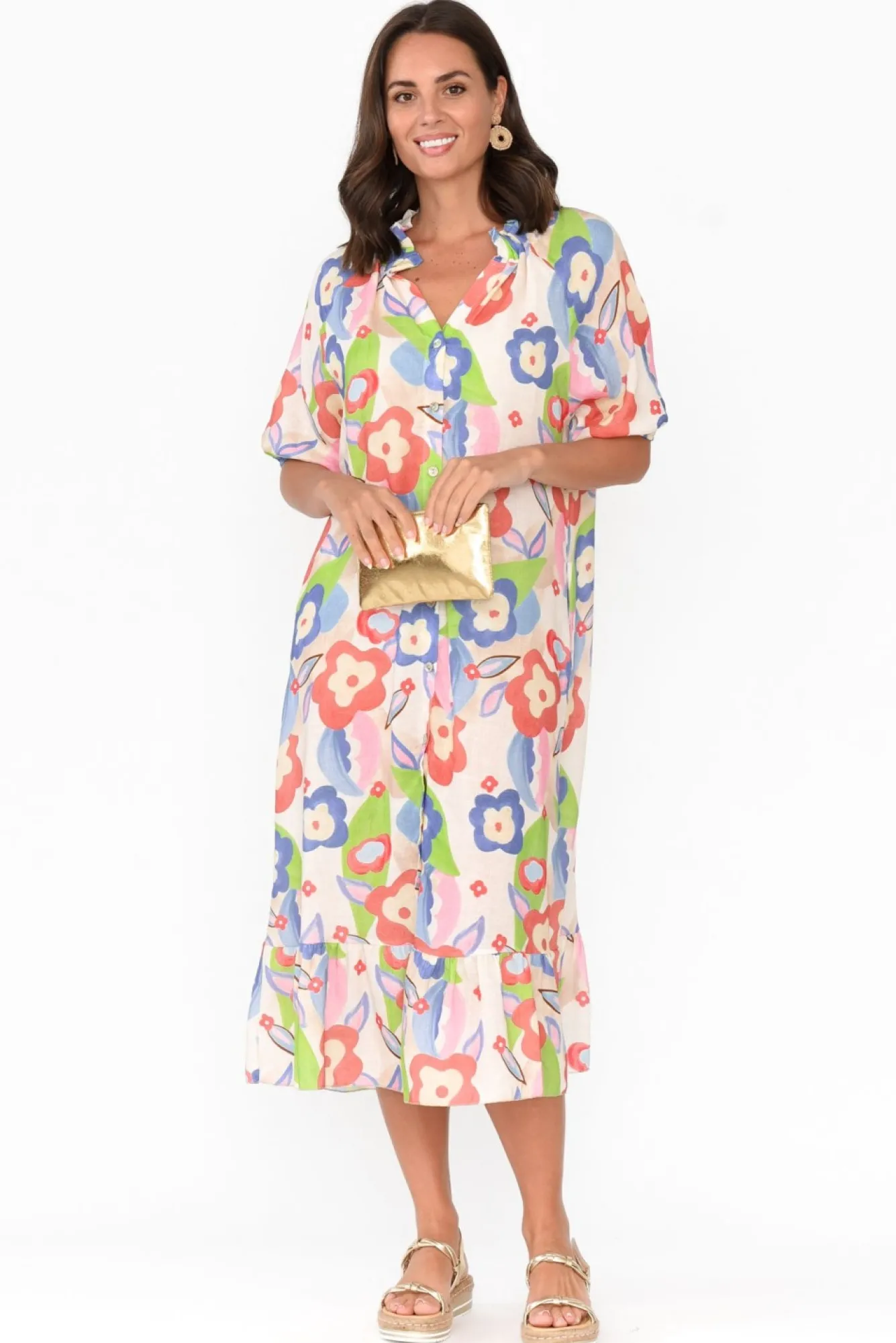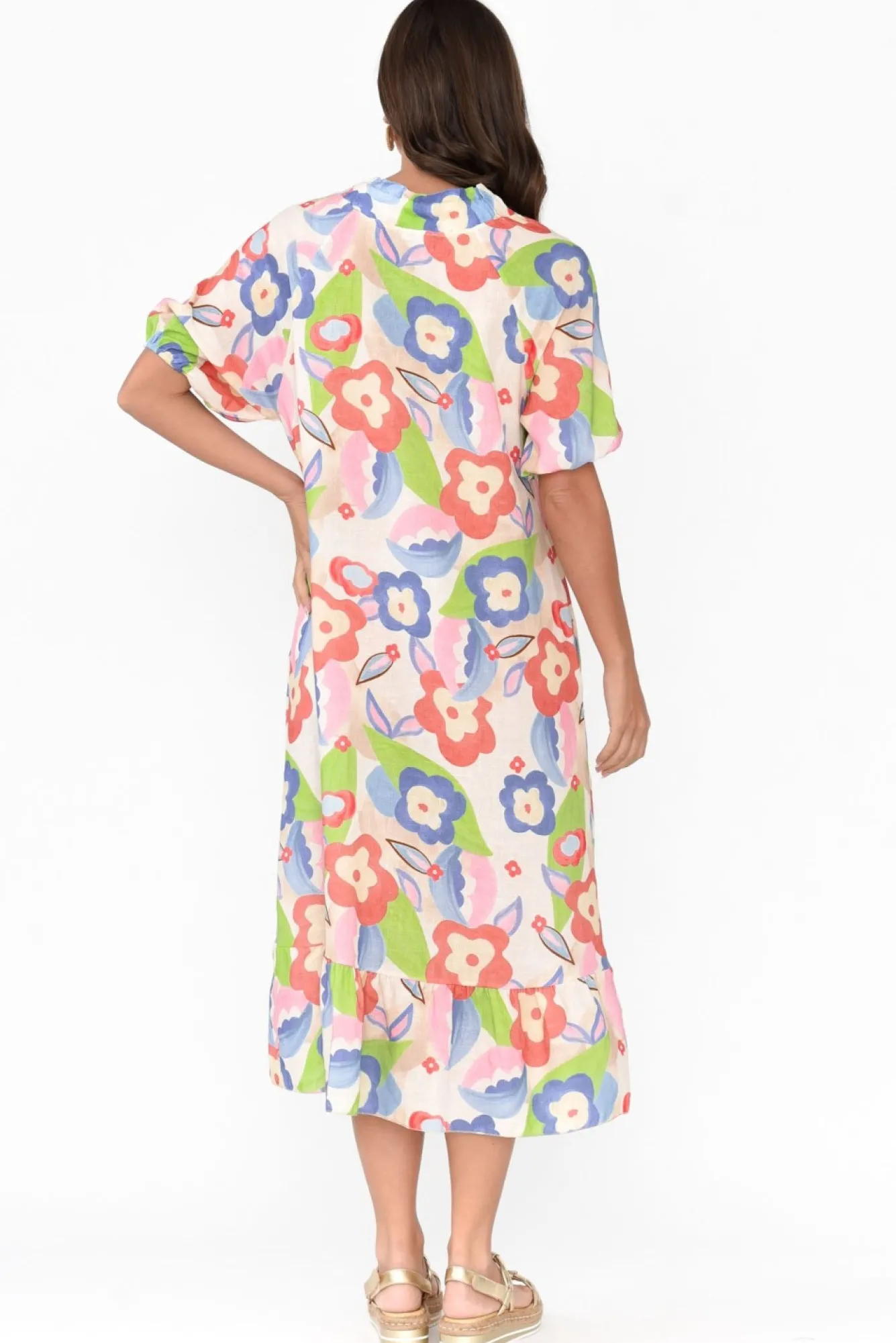 Fit: True To Size. Refer To Size & Fit Tab Below For Specific Size RecommendationNNfabric: 80% Linen, 20% Cotton Nluxurious Italian Linen Blend Boasting Lightweight And Breathable Features With A Soft, Woven Hand Feel Nrounded Frill Neckline With A V Split Flows To A Button FrontNNhalf-Length Puff Sleeves With An Elastic Cuff NNsubtle A-Line Silhouette With A Frill Hem Detail NNtwo Hip PocketsNNclassic Midi Length NNcare: Cool Gentle Machine Wash RecommendedNNcolour: Cream Base With A Dainty Floral Overlay In A Watercolour Effect