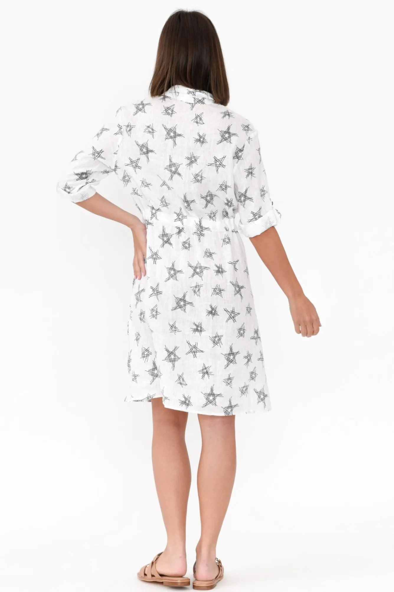 Fit: True To Size. Refer To Size & Fit Tab Below For Specific Size Recommendation NNfabric: 100% LinenNbreathable And Textured Linen Fabric NN3/4 Length Sleeves With A Button To Make Securing Rolled Sleeves A Breeze!Ncollared Neckline With A Button Front NNtwo Faux Breast Pockets NNa-Line Silhouette NNdrawstring Waist NNknee Length With A Straight Hem NNcare: Cool Gentle Hand Wash RecommendedNNcolour: White Base With Abstract Black Star Design