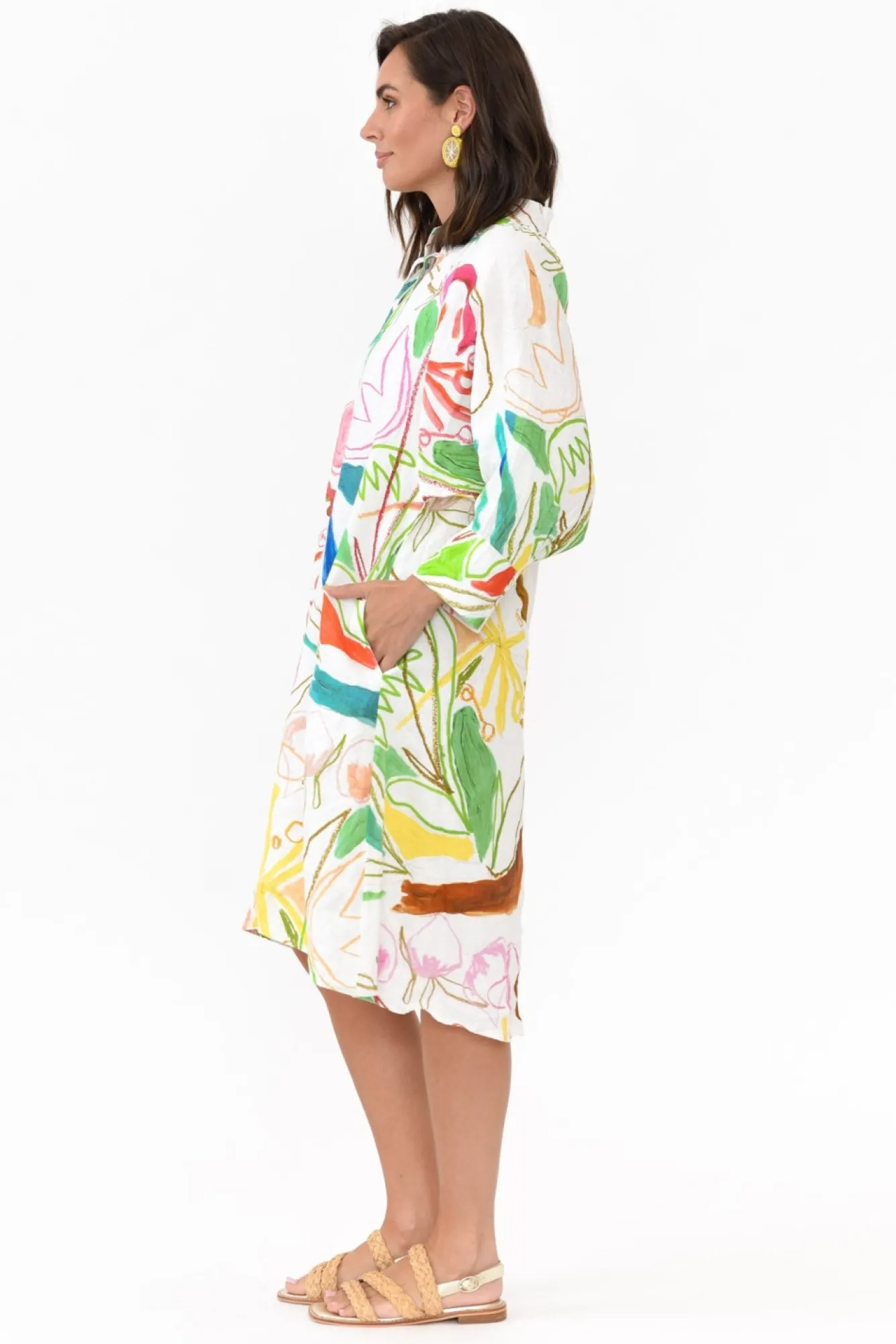 Fit: True To Size. Refer To Size & Fit Tab Below For Specific Size RecommendationNNfabric: 100% LinenNcrafted From Luxurious Linen Boasting Lightweight And Breathable Properties With A Lovely Smooth Hand Feel And A Non-Stretch FinishNNfabric Is Semi-Sheer, We Recommend Paring With Nude Undergarments Nhigh, Banded Neckline With A V-Split And Optional TieNNthree-Quarter Sleeves Featuring A Drop Shoulder And A Chic, Wide Button CuffNNpleated Details At The Neckline And Sleeve Cuff Elevate The StyleNfloaty A-Line SilhouetteNtwo Discreet Hip PocketsNhi-Lo Hem Falls To The KneesNNcare: Cool Gentle Machine Wash RecommendedNNcolour: White Base And A Multicolour Artistic Overlay