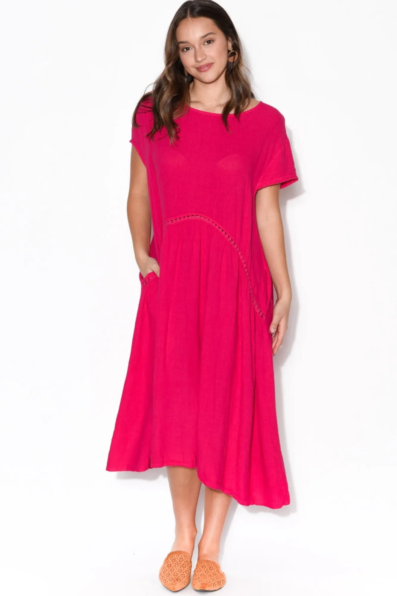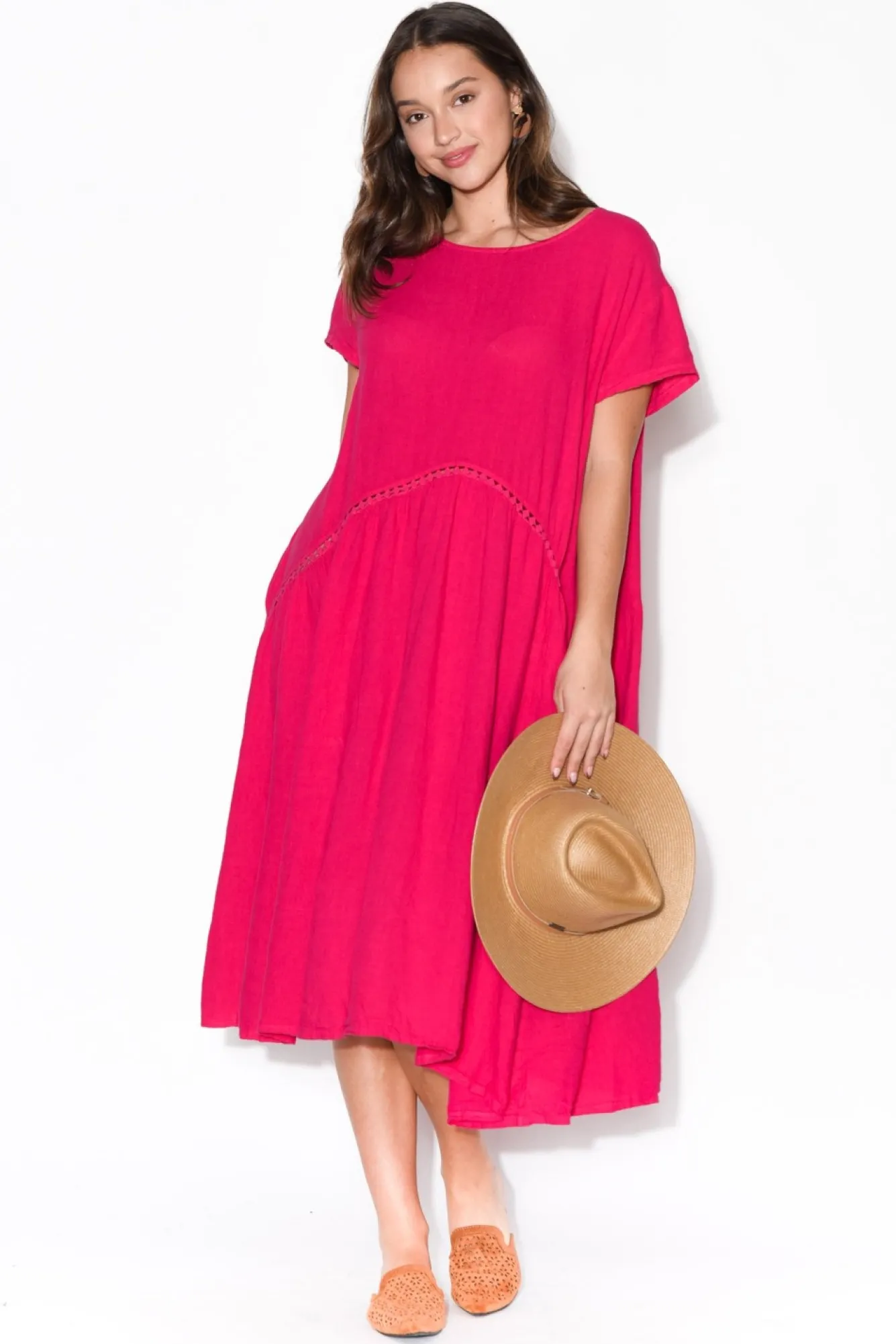 Fit: Oversized Fit. Refer To Size & Fit Tab Below For Specific Size Recommendation NNfabric: 100% LinenNa Feminine And Flattering Smock Style That Offers Comfort – Made From Breathable, Non-Stretch LinenNhandcrafted From Quality Linen In ItalyNfeaturing A Simple Round Neckline Which Compliments The CollarbonesNNkeyhole Button Closure At Back Of Neck For Easy Of WearNshort, Cap Style Sleeves Perfect For Warmer WeatherNNcurved Broderie Anglaise Peak Seam Accentuates Flattering Draping SilhouetteNNtwo Internal Pockets Located At The HipNNstraight Hemline Falls Below The KneeNNcare: Cool Gentle Hand Wash RecommendedNNcolour: Vibrant Hot Pink