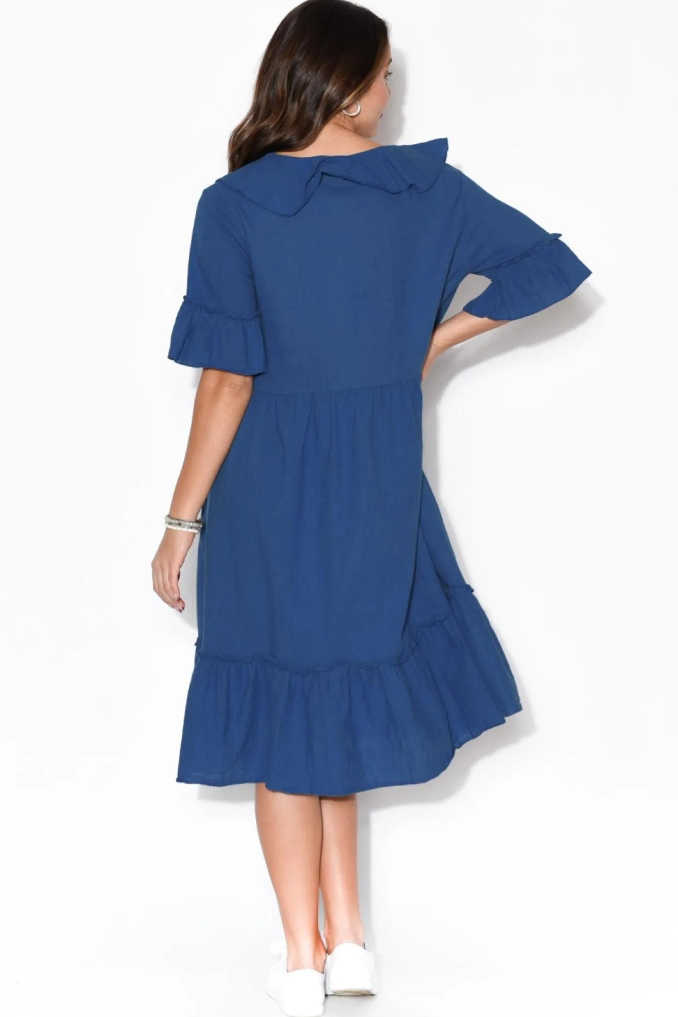 Fit: True To Size. Refer To Size & Fit Tab Below For Specific Size Recommendation NN Fabric: 50% Linen 50% CottonNstunning Lightweight, Breathable And No-Stretch FabricNNflattering V-Neckline With Cascading Frill Detail NNhalf Length Sleeves With Lovely Frill On CuffNclassic Tiered A-Line Silhouette, Designed To Be FloatyNfrill Hemline Falls Beautifully Below The Knees NNcare: Cool Gentle Hand Wash RecommendedNNcolour: Ocean Blue