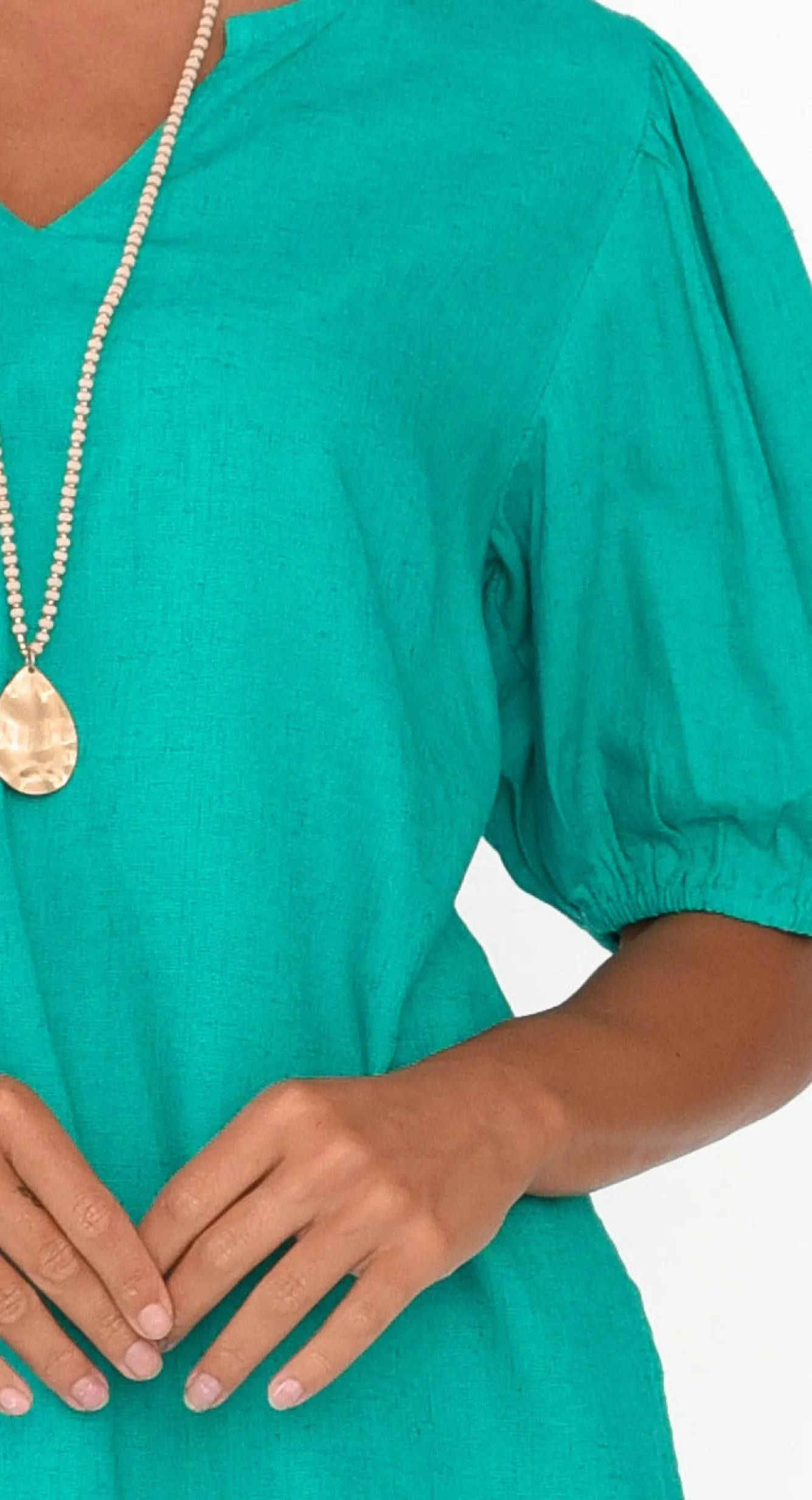 Fit: True To Size. Refer To Size & Fit Tab Below For Specific Size RecommendationNNfabric: Viscose/LinenNbreezy, Lightweight And Non-Stretch Linen Blend Fabric With A Woven FeelNNfeature V-Split Neckline Frames The Collarbones Nhalf-Length Puff Sleeves With An Elasticated Cuff And Soft Pleating NNrelaxed A-Line Silhouette Enhanced By Small Side Splits NNcurved Hemline Falls To Hip LengthNNNcare: Cool Gentle Machine Wash RecommendedNNcolour: Oceanic Teal