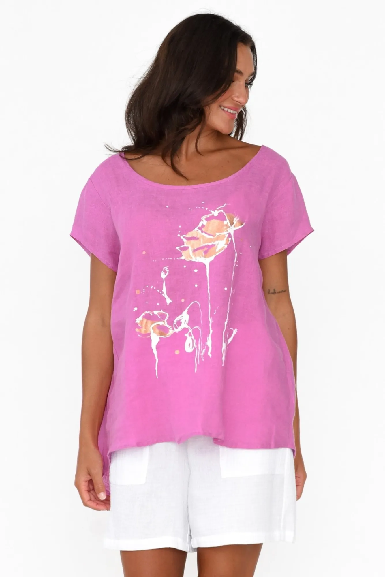 Fit: True To Size. Refer To Size & Fit Tab Below For Specific Size RecommendationNNfabric: 100% LinenNcrafted From A Classic Woven Linen Offering Wonderful Breathability And A Lightweight, Non-Stretch Hand FeelNNwide Round Neckline Accentuates Collarbones NNshort Tee-Style Sleeves And Drape Silhouette Create A Timeless, Everyday StyleNstylish Foil Printed Abstract Flower GraphicNtriangular Pleating At The Back Offers Unrestricted Comfort And MovementNNslight Hi-Lo Hemline Falls Below The HipsNNNcare: Cool Gentle Machine Wash RecommendedNNcolour: Light Magenta With A White And Copper Print