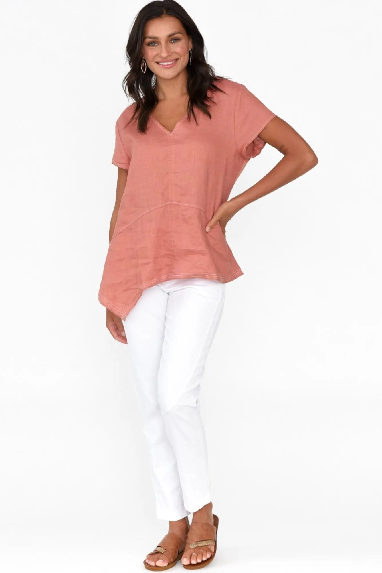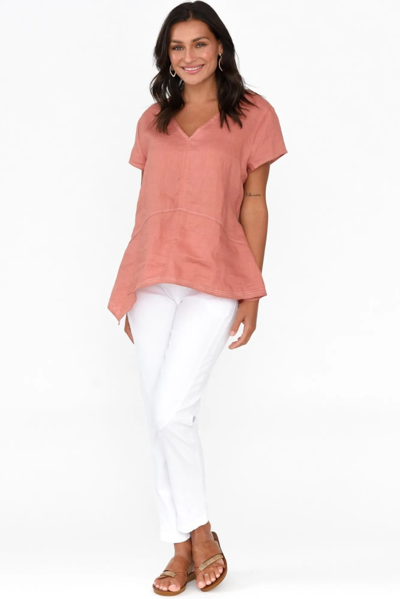 Fit: True To Size. Refer To Size & Fit Tab Below For Specific Size RecommendationNNfabric: 100% LinenNlightweight, Breathable And Non-Stretch Linen With A Signature Woven Hand Feel NNsharp V-Neckline Highlights The Collarbones NNwhite Contrast Stitching Throughout Defines The SilhouetteNclassic Short Tee-Style Sleeves Nversatile A-Line Silhouette Enhanced By Subtle Peak Stitching Detail NNfeaturing A Delicate Flower Embroidery At The Back, Near The ShouldersNNback Features Two Contrasting Side Panels With A Slightly Stretchy Finish For Ease Of Movement NNelevated Asymmetric Hemline Falls To A Comfortable Hip Length NNNcare: Cool Gentle Machine Wash RecommendedNNcolour: Dusty Rust Hue With White Contrast Stitching