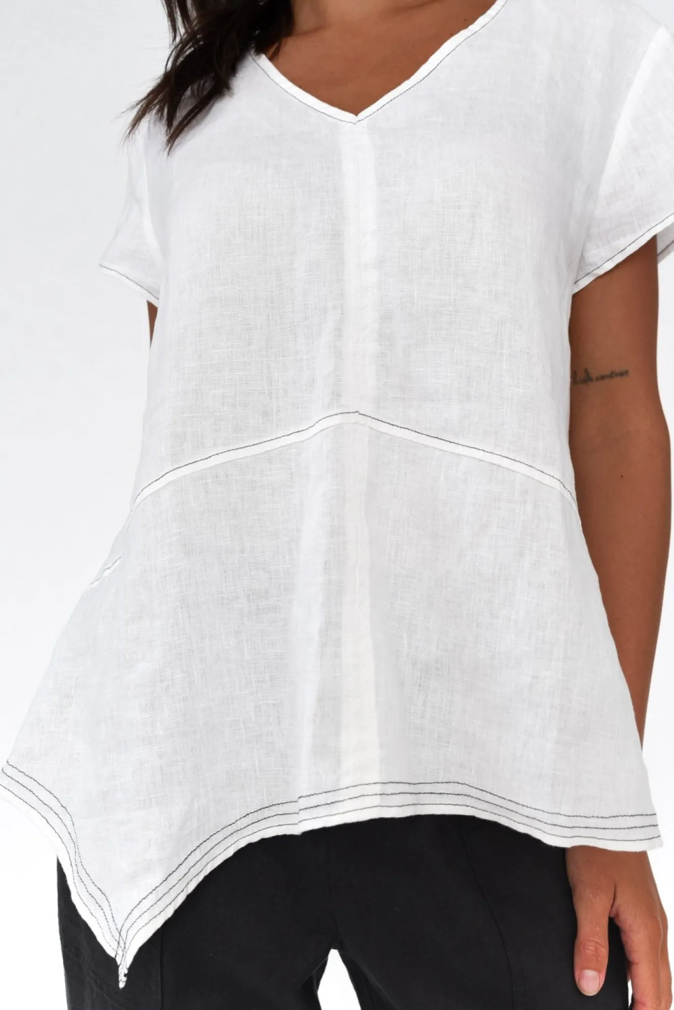 Fit: True To Size. Refer To Size & Fit Tab Below For Specific Size RecommendationNNfabric: 100% LinenNultra-Breathable, Lightweight And Non-Stretch Linen With A Classic Woven Finish NNfabric Is Sheer, We Recommend Pairing With Nude Undergarments Nfeature V-Neckline Complements The Short Tee-Style Sleeves Nsilhouette Defined By Black Contrast Stitching Neveryday A-Line Silhouette Exaggerated By A Subtle Peak Stitching Detail NNfeaturing A Delicate Flower Embroidery At The Back, Near The ShouldersNNback Features Two Contrasting Side Panels With A Slightly Stretchy Finish For Ease Of Movement Nunique Asymmetric Hemline Drapes To The Hips NNcare: Cool Gentle Machine Wash RecommendedNNcolour: Crisp White With Black Contrast Stitching