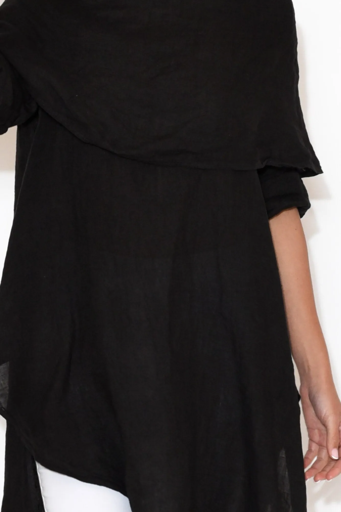 Fit: True. Refer To Size & Fit Tab Below For Specific Size Recommendation NNfabric: 100% LinenNmade In ItalyNlightweight, Soft, Breathable Fabric NNboat Neckline With Folded Over Cowl Neck Layered DesignNNfull-Length Sleeve With Button Cuff Fastening Up The Arm To Allow You To Roll The Cuff NNrelaxedNasymmetrical Hemline, Cutting Diagonally Across Front And Back NNabove-Knee Length NNNcare: Cool Gentle Machine Wash RecommendedNNcolour: Versatile Black