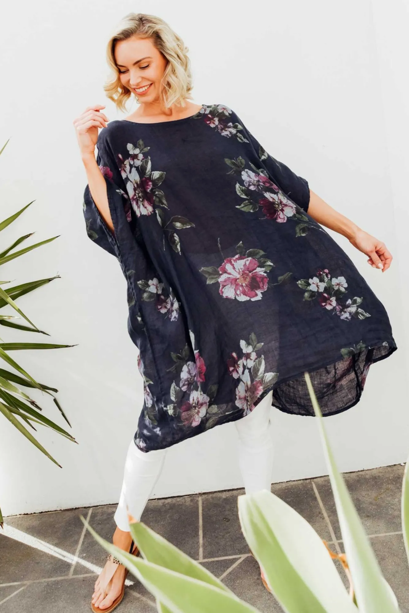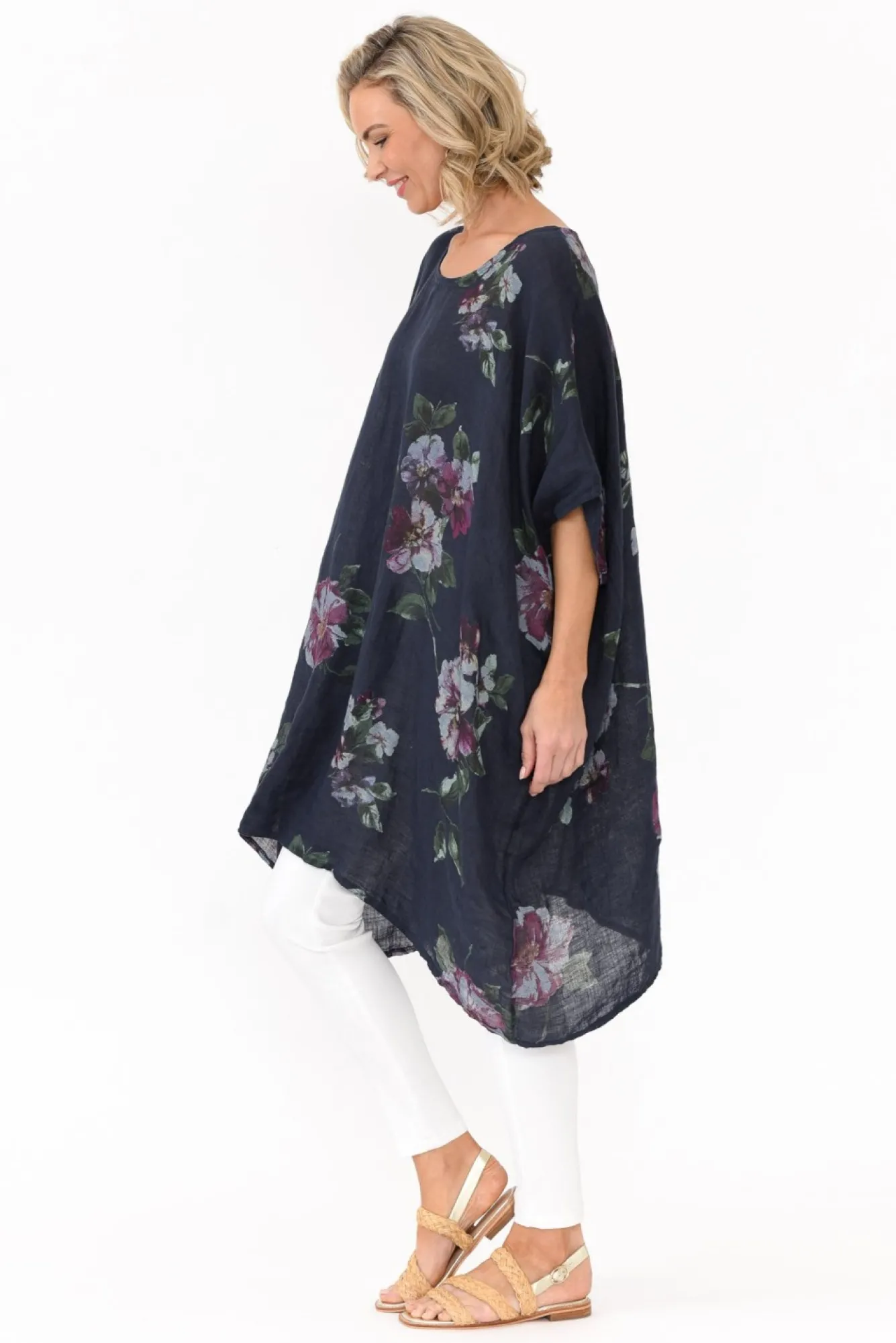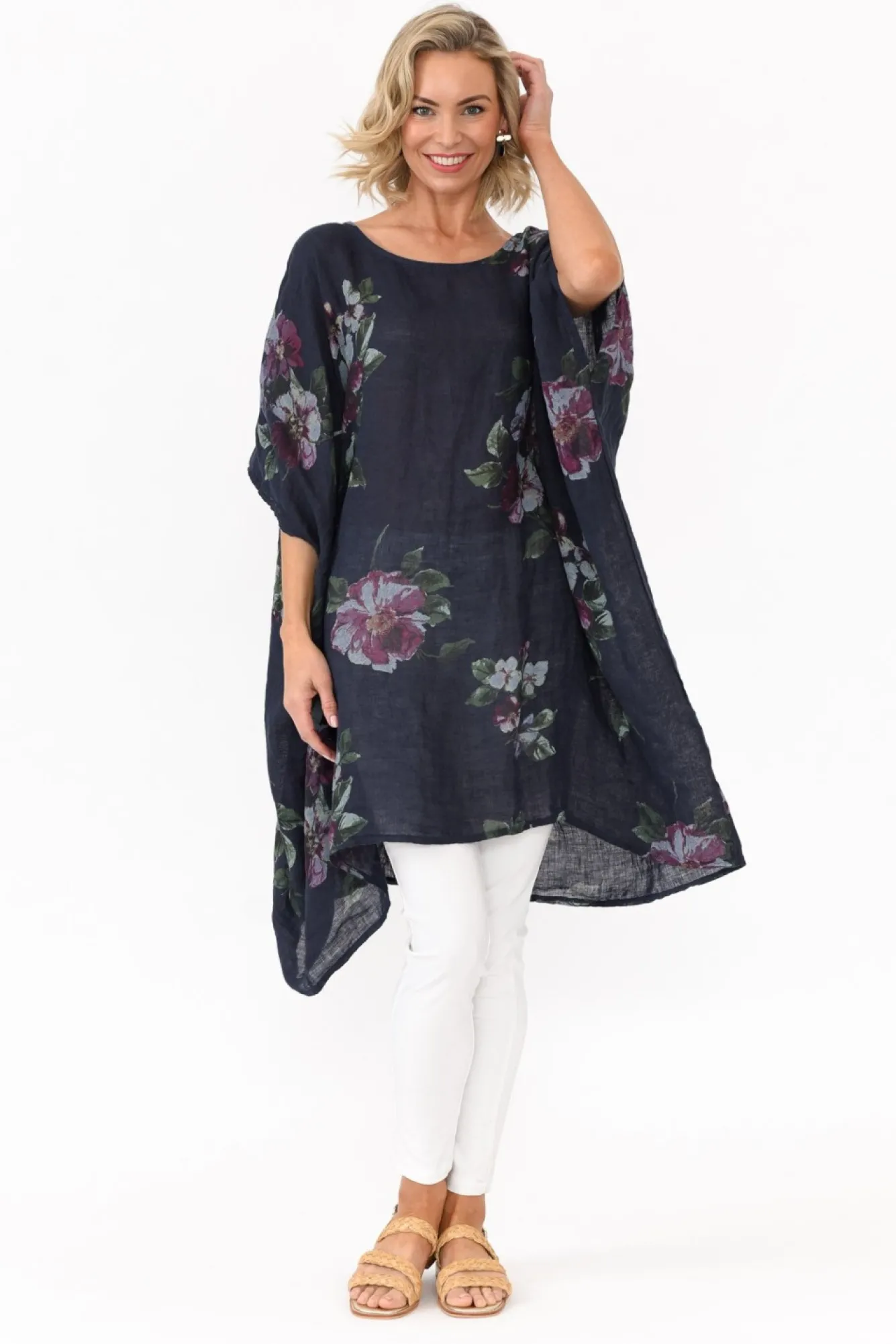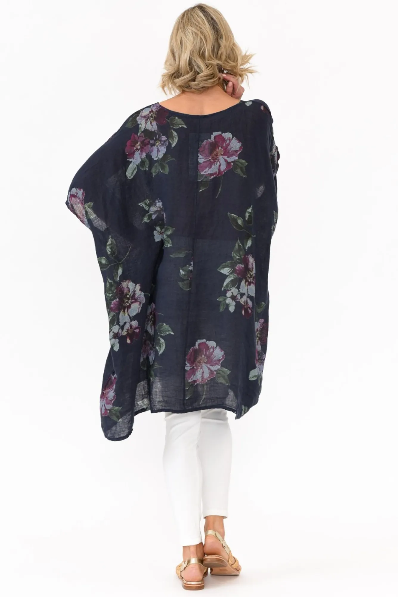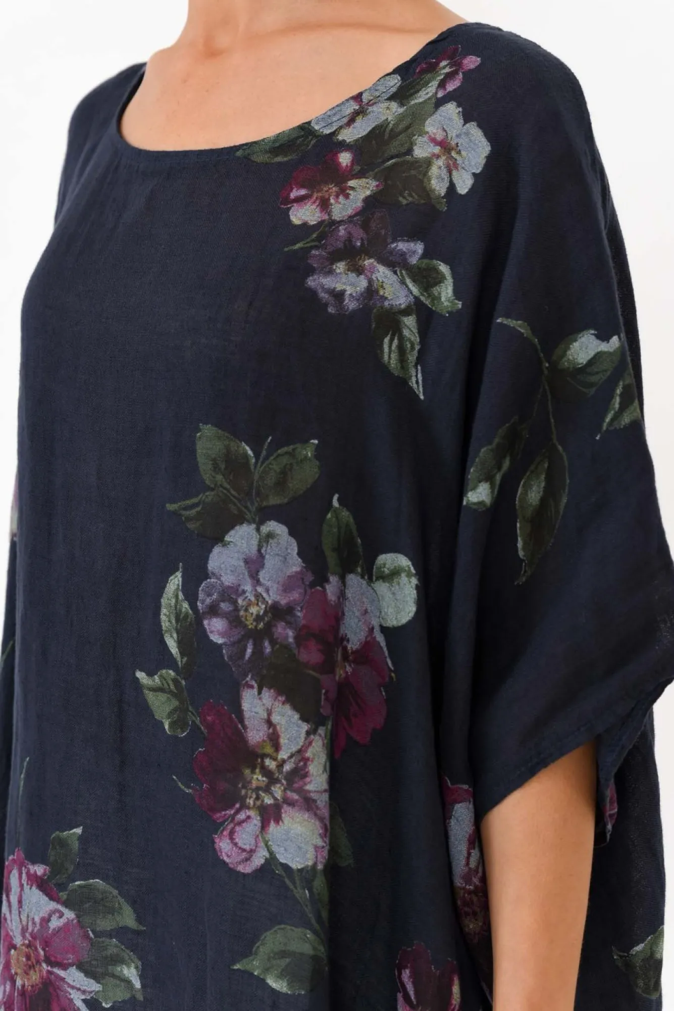 Fit: One Size. Refer To Size & Fit Tab Below For Specific Size Recommendation NNfabric: 100% LinenNmade In Italy Using Breathable, Lightweight And Textured LinenNoversized Design Creates A Dramatic Yet Flattering Drape SilhouetteNclassic Round NecklineNdrapes Below Hip-Length NNNcare: Cool Gentle Hand Wash RecommendedNNcolour: True Navy Blue With A Soft Floral OverlayNNNstyle Tip: This Fabric Is Partially Sheer. Pair With Your Favourite Camisole For Added Comfort Or Use As Beach Throw-Over.
