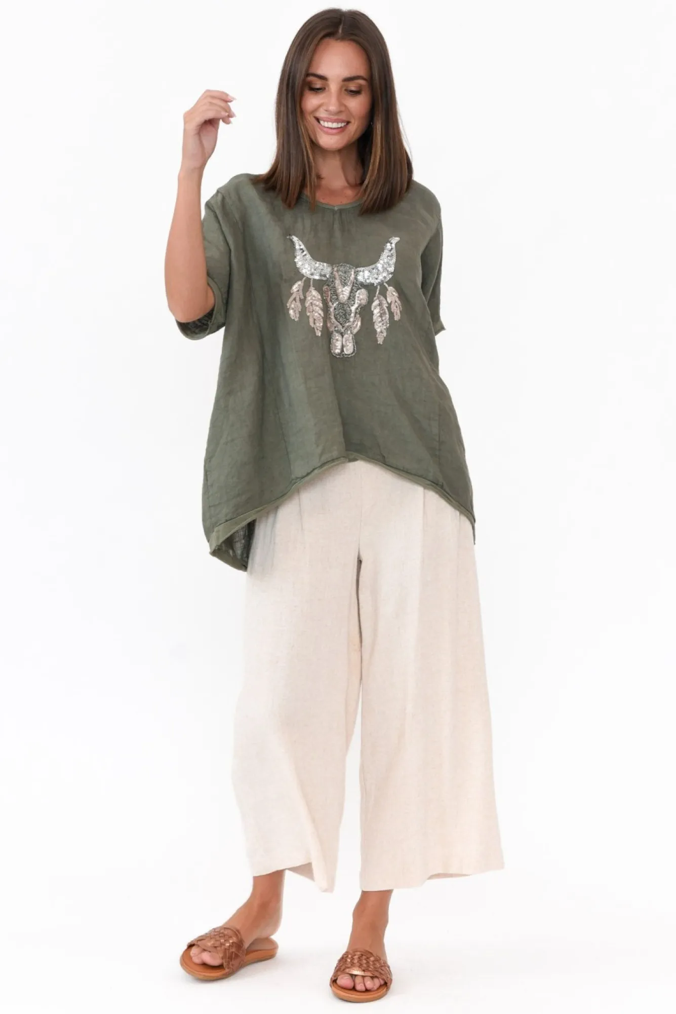 Linen Tops<Donna Donna Wild West Khaki Sequin Linen Tee