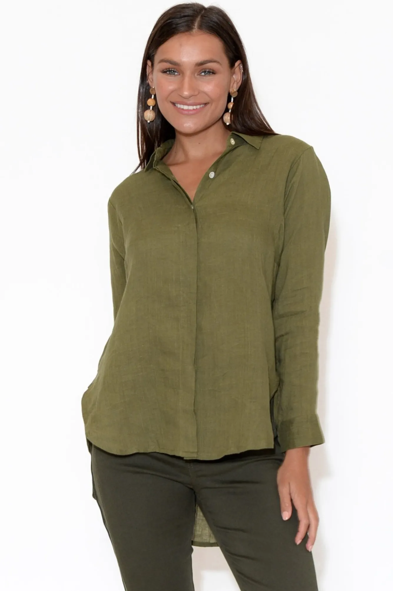 Fit: True To Size. Refer To Size & Fit Tab Below For Specific Size Recommendation NNfabric: 100% LinenNa Wardrobe Staple, Breathable, Non-Stretch Linen ShirtNhidden Button Down Design With CollarNfull Length Sleeves With Buttoned CuffNNrelaxed Silhouette With Darting At BustNfeature Hi-Lo Hemline With Subtle CurveNNstyle Falls Below The Hip At BackNNNcare: Cool Gentle Machine Wash RecommendedNNcolour: Olive Green Shade