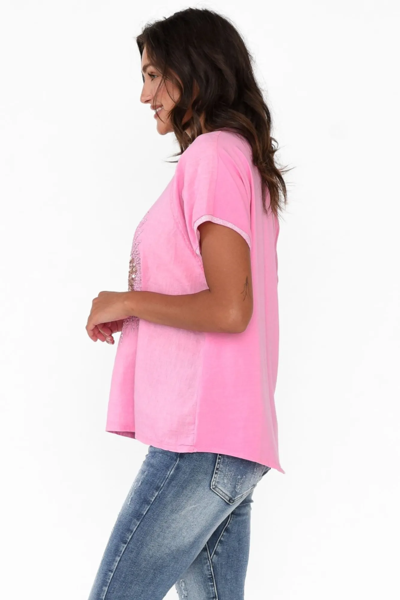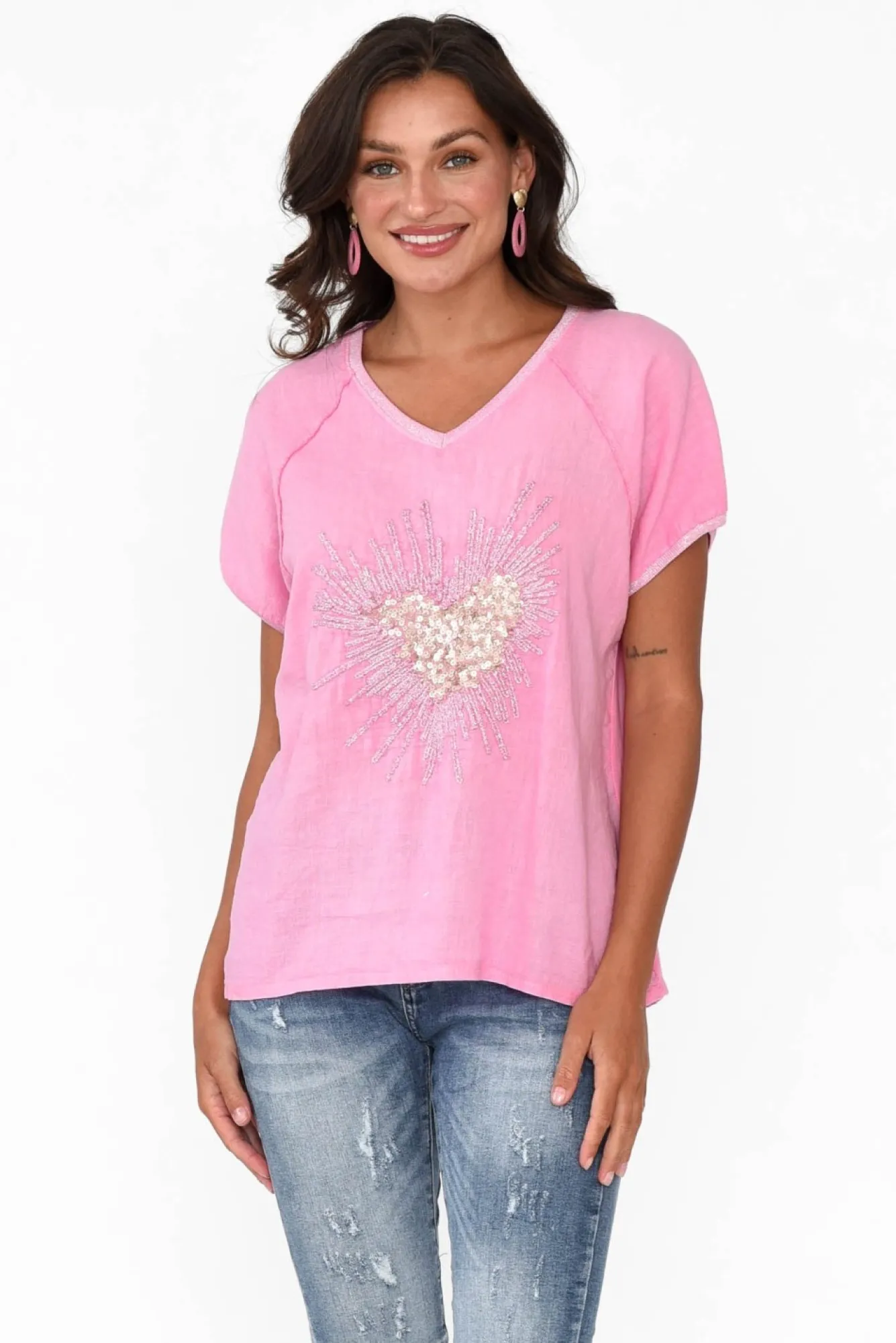 Fit: True To Size. Refer To Size & Fit Tab Below For Specific Size RecommendationNNfabric: 80% Linen, 20% CottonNcrafted From Ultra-Breathable, Breezy And Non-Stretch Linen Blend Fabric NNmade In ItalyNv-Neckline Enhanced By Metallic Trim Detail That Matches The Sleeves NNshort Sleeves With Exposed Raglan Sleeve Stitching NNa-Line Silhouette With A Contrast Design – Front Woven Panel And Soft, Stretchy BackNdramatic Sequin Heart Embellishment Outlined By Metallic Thread Detailing NNslight Hi-Lo Hem Falls To A Comfortable Hip Length NNNcare: Cool Gentle Machine Wash RecommendedNNcolour: Candy Pink With A Gold Sequin Heart Silver Thread Embellishment