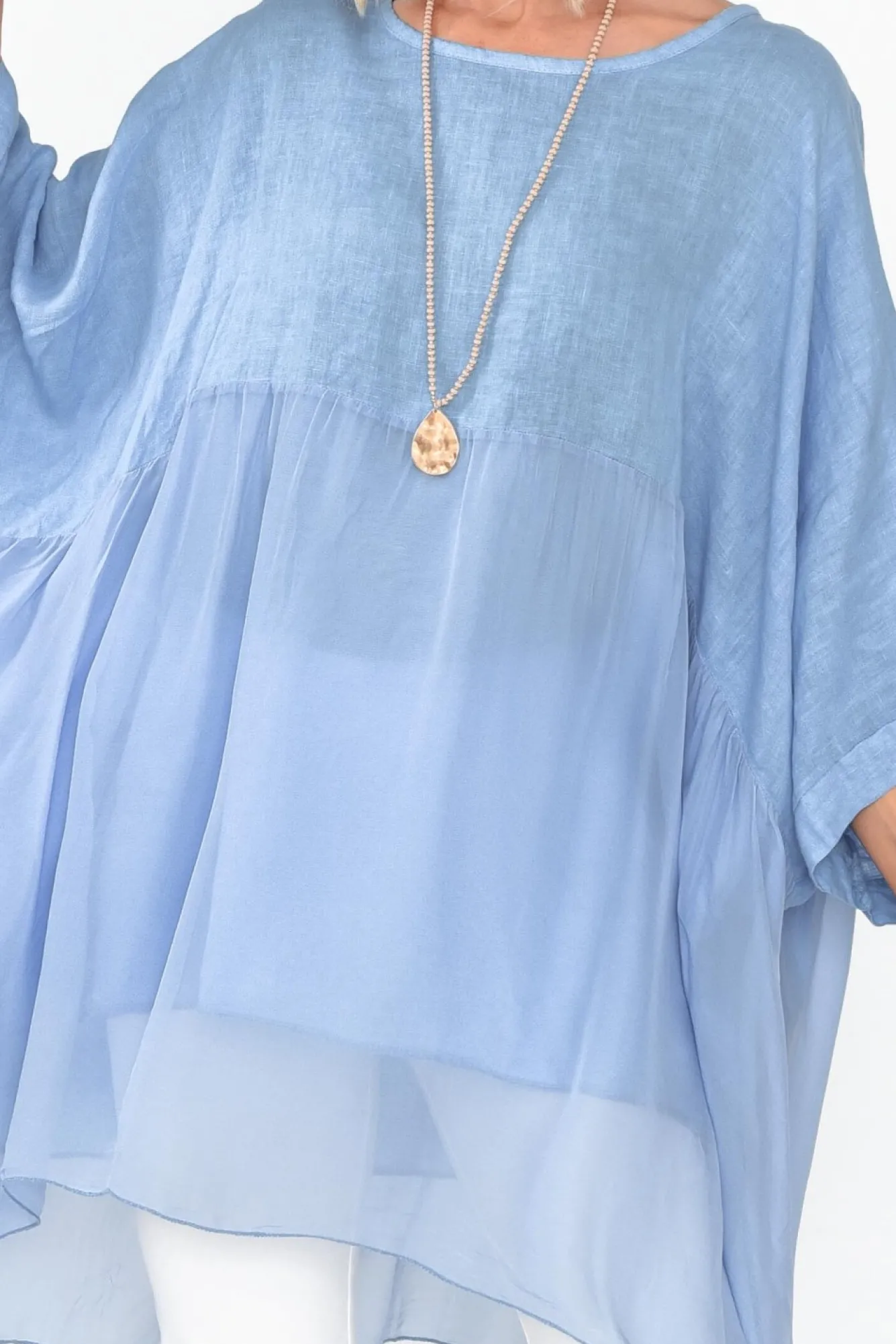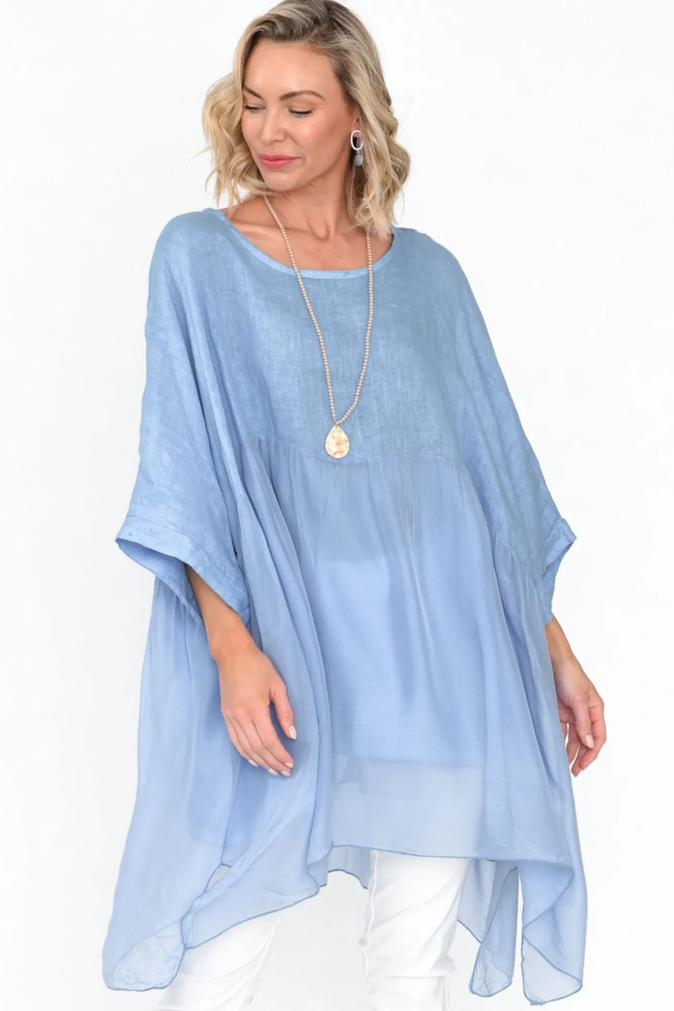 Fit: Oversized Fit. Refer To Size & Fit Tab Below For Specific Size RecommendationNNfabric: 60% Linen, 30% Silk, 10% CottonNmade In Italy Using Natural Fibres And Delicate Silk, Offering Signature Breathability And A Lightweight Hand Feel Nfabric Is Semi-Sheer, We Recommend Pairing With Nude Undergarments Nround Neckline Complements The 3/4 Length Drape Sleeves Neffortless Drape Silhouette With An Elevated Silk Overlay That Cascades From The Waist NNlined With A Cotton Fabric From The Waist Nasymmetric Hemline Falls Below Hip Length NNNcare: Cool Gentle Hand Wash RecommendedNNcolour: Deep Sky Blue Shade