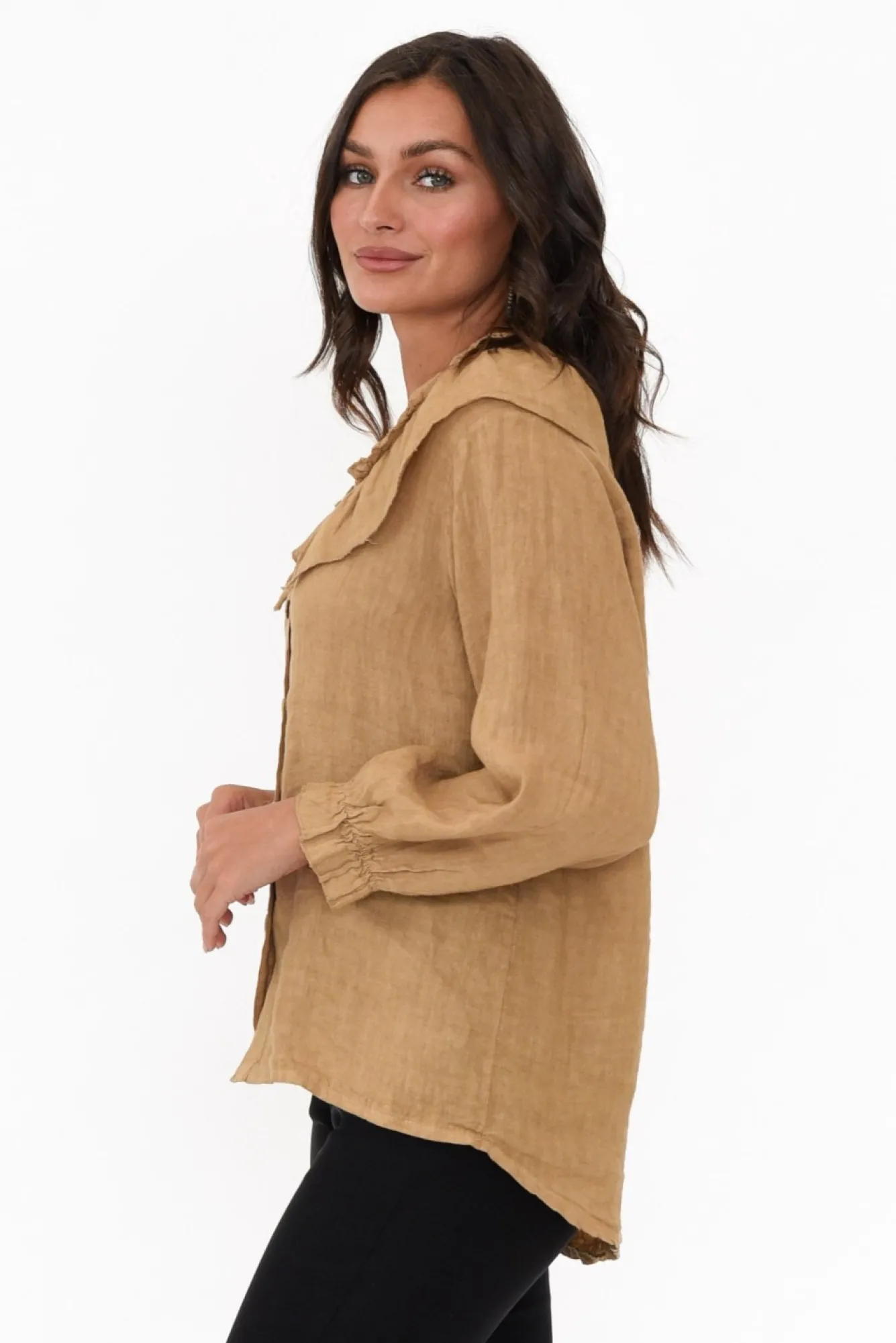 Fit: True To Size. Refer To Size & Fit Tab Below For Specific Size RecommendationNNfabric: 100% LinenNgorgeous Textured Italian Linen With A Lightweight And Soft FeelNfeminine Frills Along The V-Neckline And Elasticised CuffNNfull Length Sleeves Can Be Pushed Up To The Elbows Ngorgeous Pearled Buttons Nclassic Straight Silhouette Is Complemented By A Hi-Lo HemlineNNhemline Grazes The HipsNNNcare: Cool Gentle Machine Wash RecommendedNNcolour: Lovely Tan Shade