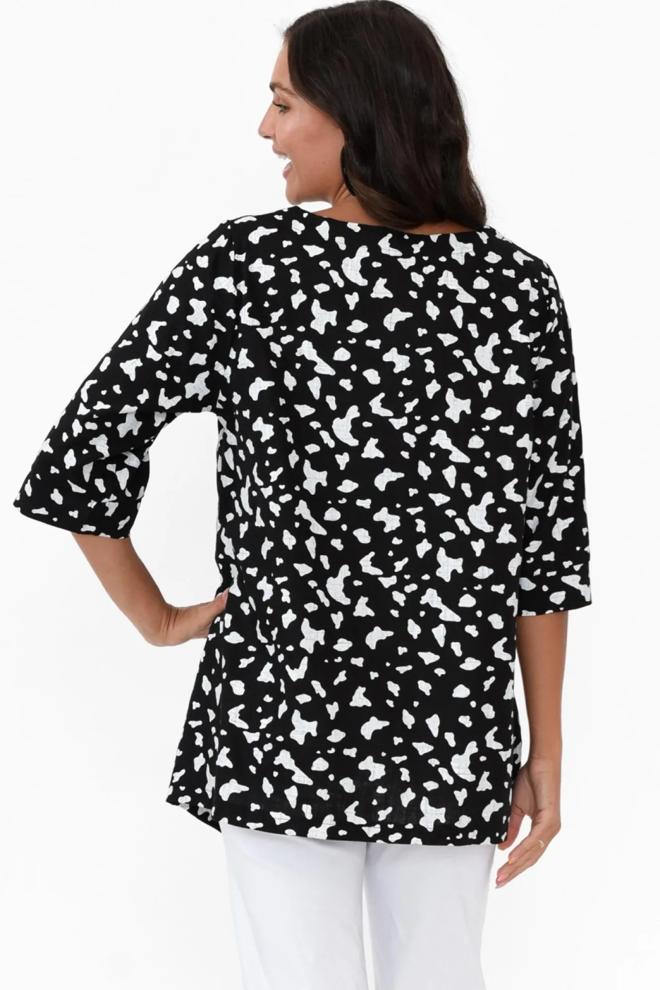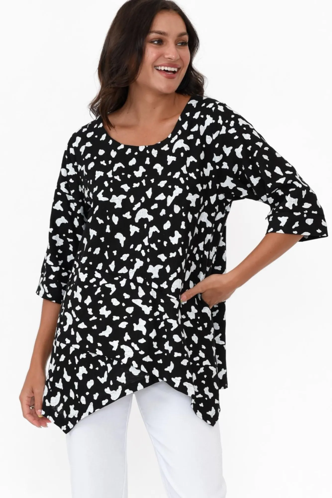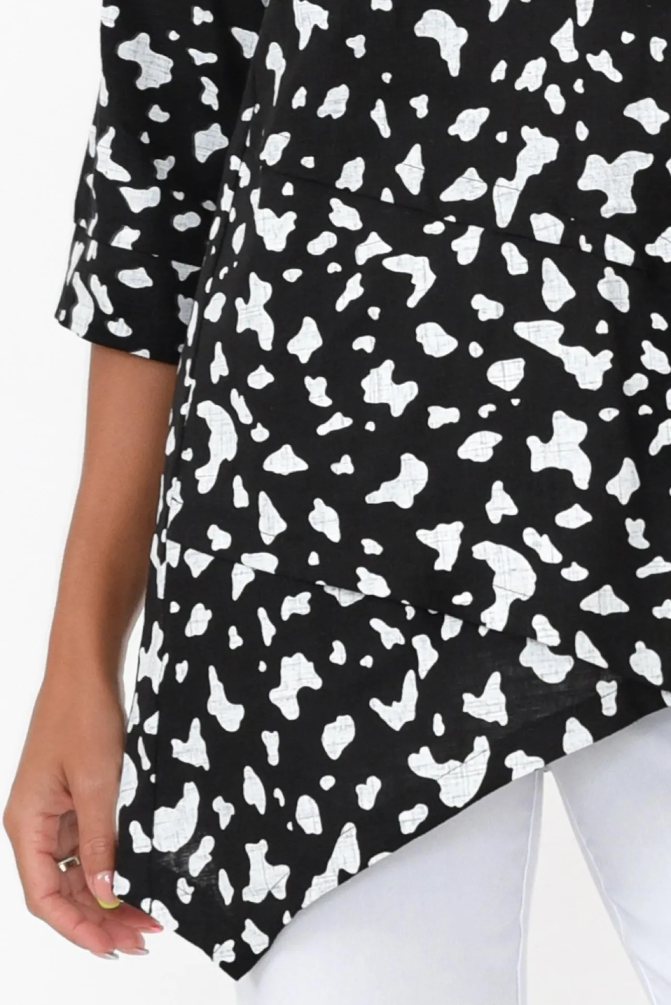 Fit: True. Refer To Size & Fit Tab Below For Specific Size RecommendationNNfabric: 65% Linen, 35% CottonNcomfortable Lightweight, Non-Stretch Woven Linen/Cotton Fabric With Lovely BreathabilityNsimple Rounded NecklineNNstraight 3/4 Length SleevesNtimeless A-Line SilhouetteNasymmetric Layered Criss-Cross Hemline Creates A Flattering FigureNNcare: Cool Gentle Hand Wash RecommendedNNcolour: Midnight Black Base With White Splash Spot Print