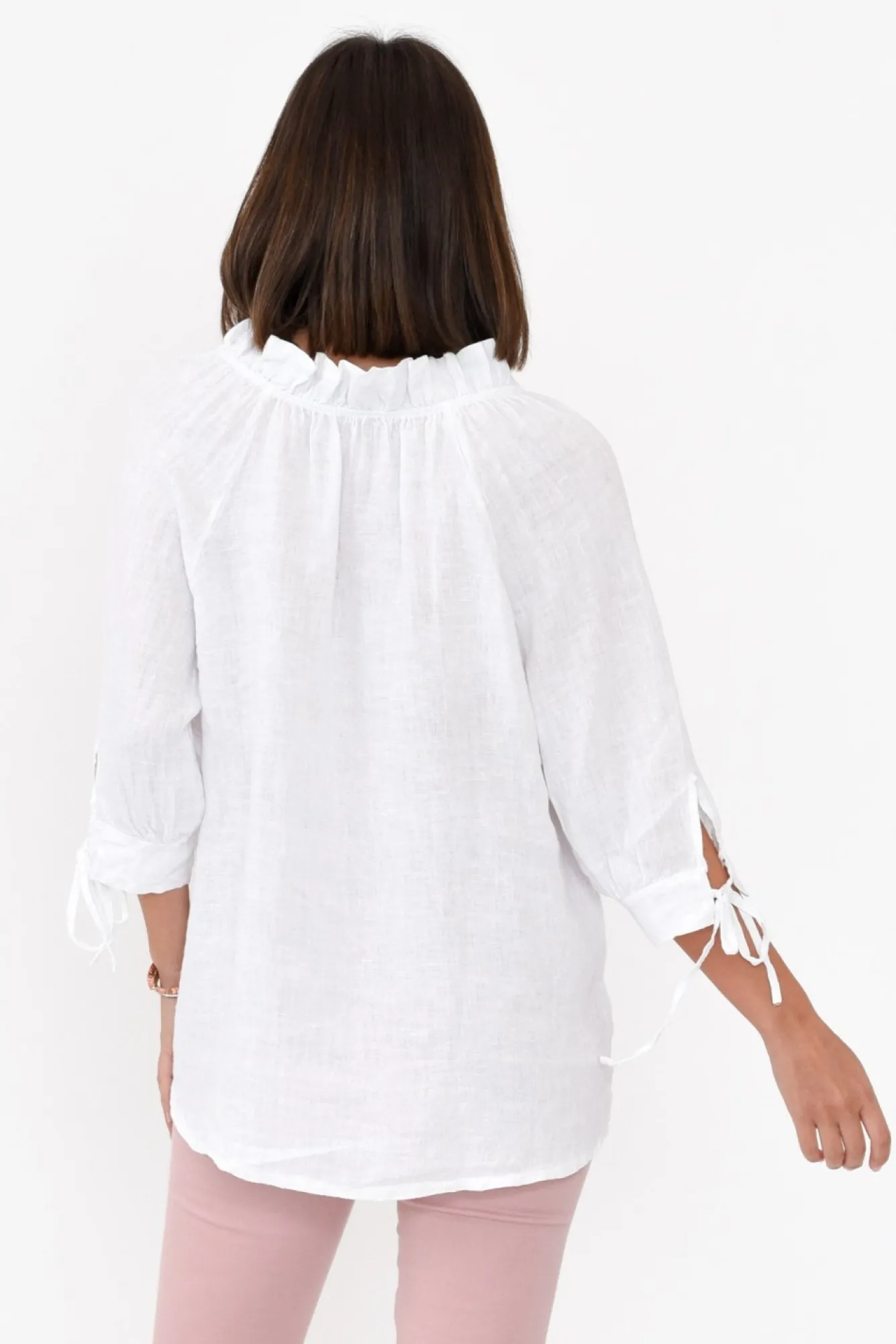 Fit: True To Size. Refer To Size & Fit Tab Below For Specific Size RecommendationNNfabric: 100% LinenNgorgeous White Summer Blouse Made From Luxurious Lightweight, Breathable And Soft FabricNhandcrafted In ItalyNv-Neckline With Lovely Stretch Frill DetailingNNhalf Sleeves With Adjustable Tie Cuff NNrelaxed A-Line SilhouetteNhi-Lo Hemline Falls To A Hip Skimming LengthNNcare: Cool Gentle Machine Wash RecommendedNNcolour: Crisp White Shade