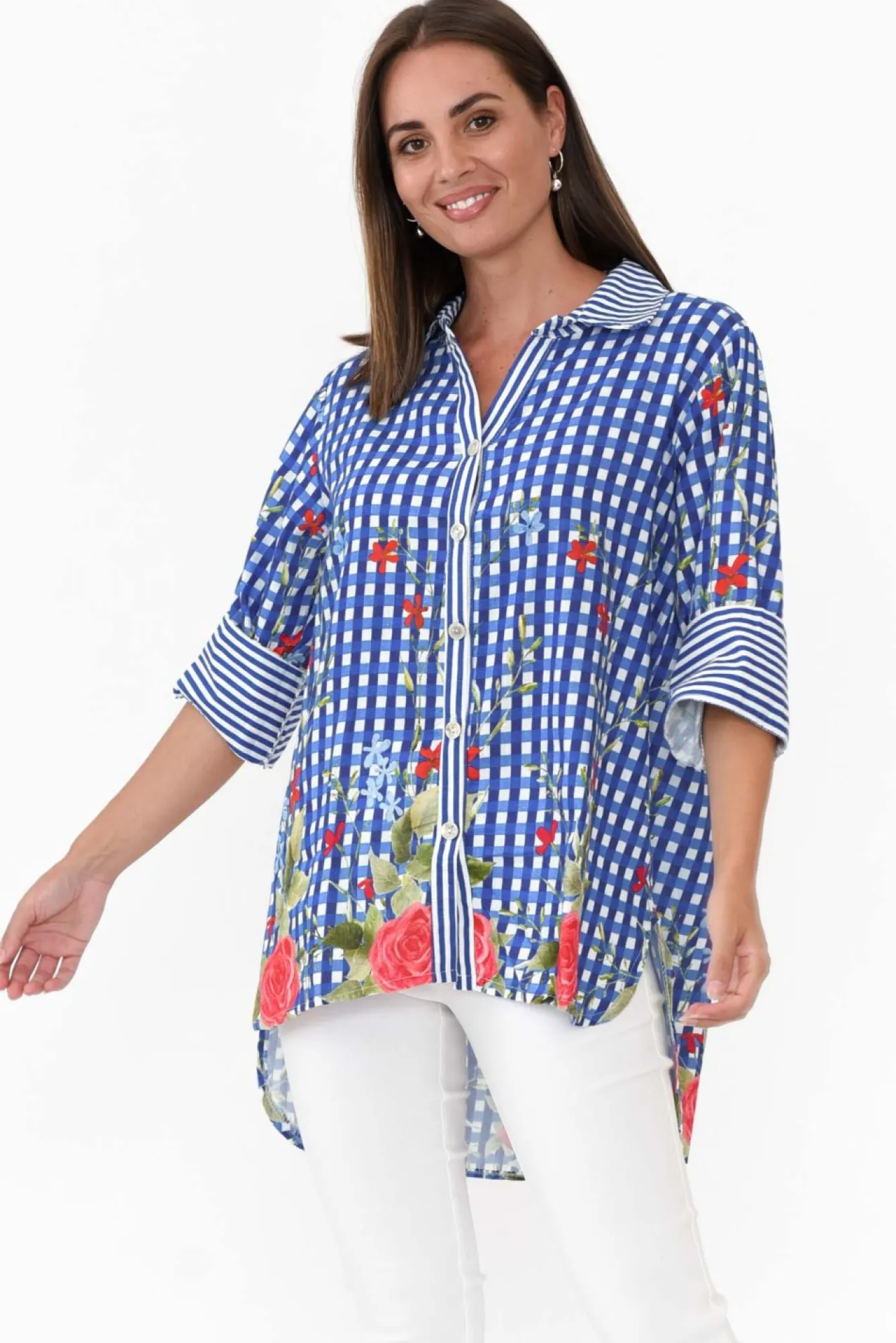 Fit: True To Size. Refer To Size & Fit Tab Below For Specific Size RecommendationNNfabric: 80% Linen, 20% CottonNlightweight, Breathable And Soft Linen Cotton Blend With A Woven TextureNfunky Striped Collared Neckline Nthree-Quarter Length Sleeve NNstraight SilhouetteNhi Lo Hemstyle Falls To A Hip Skimming LengthNNcare: Cool Gentle Machine Wash RecommendedNNcolour: Blue Gingham With A Fabulous Rose Print