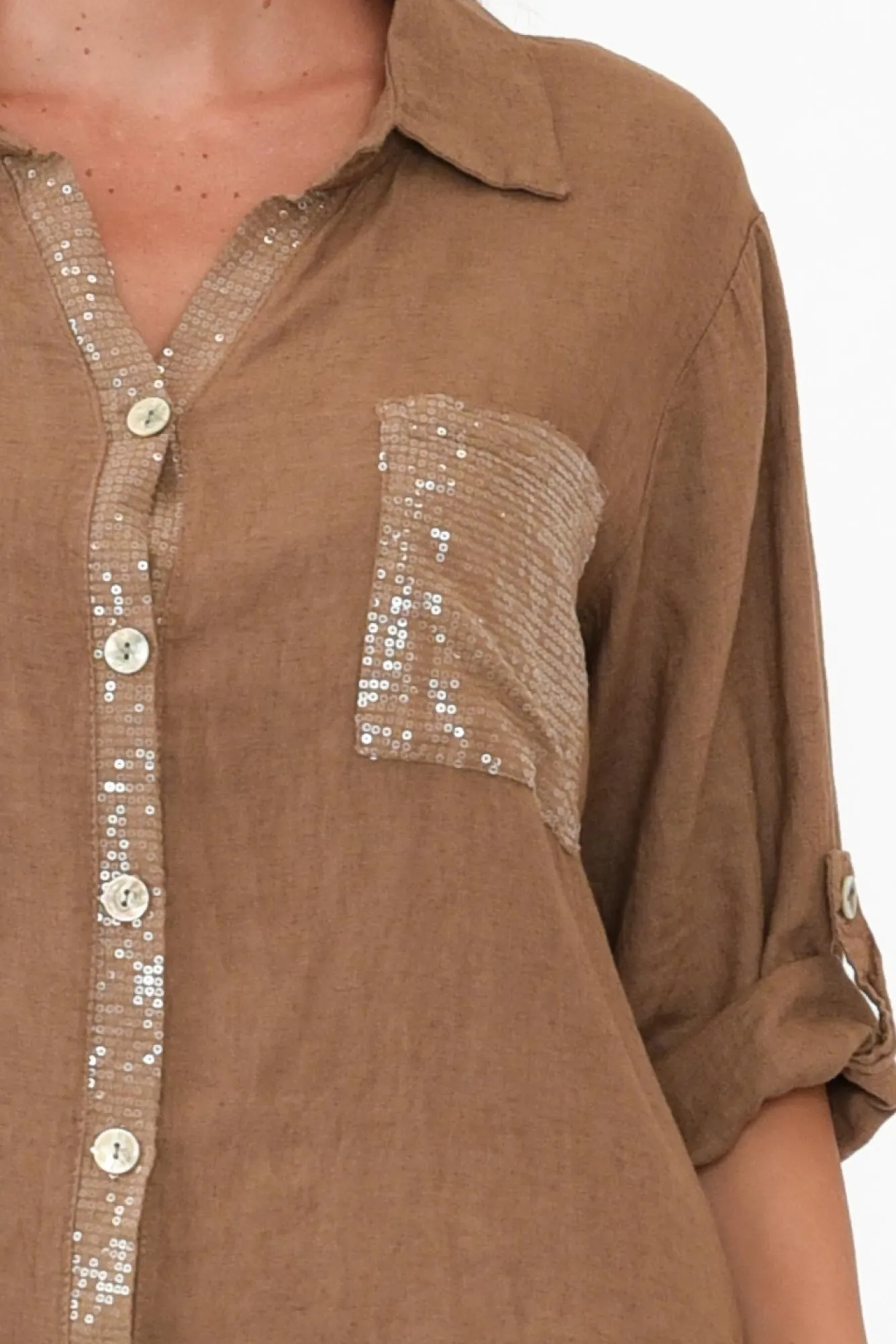 Fit: True To Size. Refer To Size & Fit Tab Below For Specific Size RecommendationNNfabric: 75% Linen, 15% Cotton, 10% PolyesterNcrafted In Italy From Lightweight, Breathable And Non-Stretch Linen Blend Fabric Nsharp Collared Neckline The Button-Down FrontNsequined Button Placket And Breast PocketNfull-Length Sleeves Can Be Rolled Up And Secured With A Button TabNNversatile Straight Silhouette With Sequin Back Panel For An Elevated Look NNhi-Lo Hemline Falls Below Hip Length NNcare: Cool Gentle Machine Wash RecommendedNNcolour: Washed Brown Shade