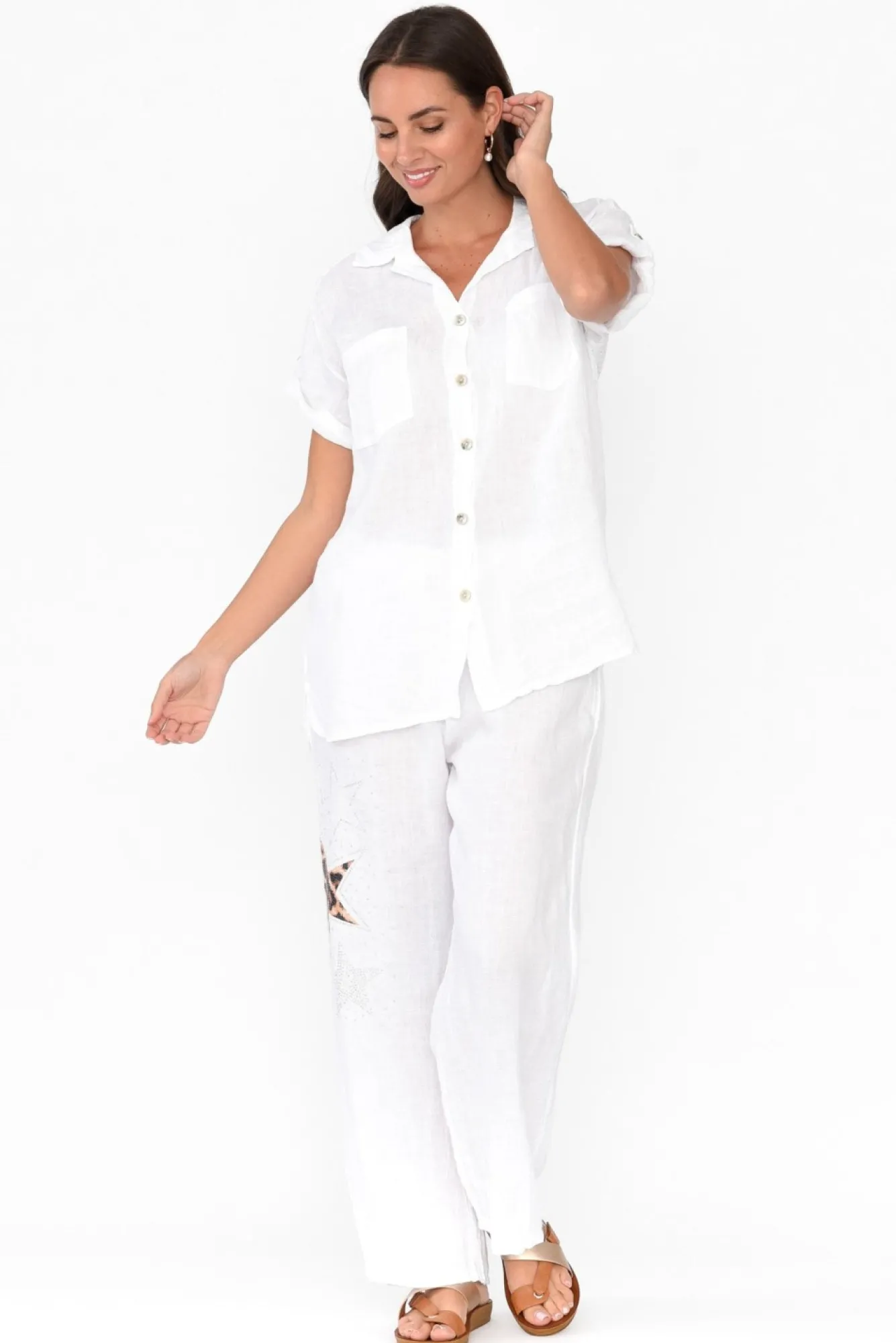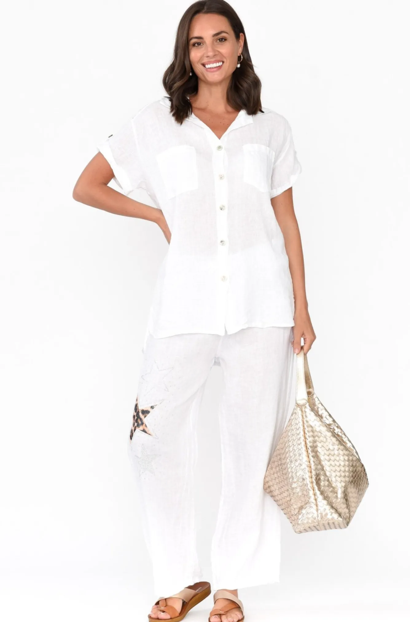 Fit: True To Size. Refer To Size & Fit Tab Below For Specific Size RecommendationNNfabric: 70% Linen, 30% Cotton Nbreathable And Lightweight Garment With A Woven Linen Front And A Cotton Broderie Anglaise Back Ncollared Neckline Flows To A Classic Button FrontNthe Sequinned Panel At The Back Features A Leopard Print And Metallic Foil Detailing Ntwo Breast PocketsNstraight Silhouette With A Relaxed Fit Ndramatic Hi-Lo Curved Hem Offers More Coverage At The BackNNcare: Cool Gentle Machine Wash RecommendedNNcolour: Classic White With A Leopard Print Panel At The Back NNstyle Tip: This Style Does Not Contain A Lining. Due To The Nature Of Broderie Anglaise, We Recommend Pairing With Your Favourite Cami For Added Coverage And Comfort.
