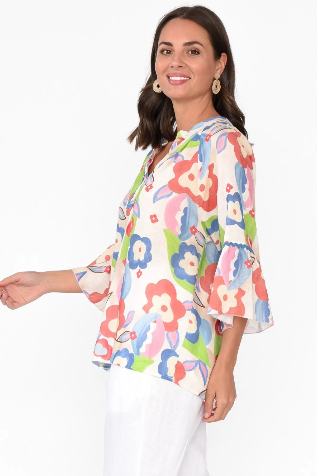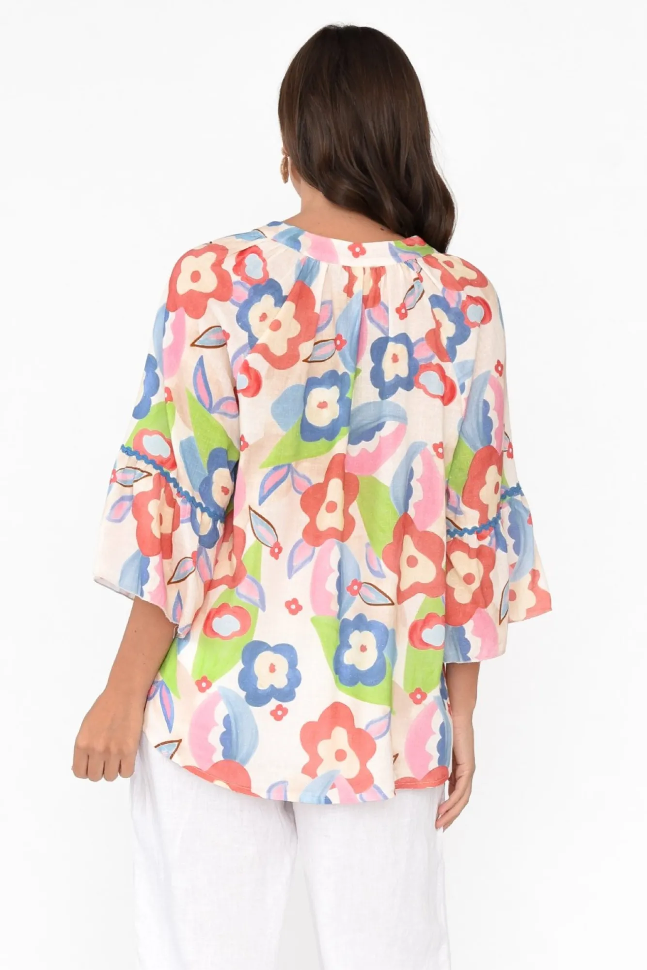 Fit: True To Size. Refer To Size & Fit Tab Below For Specific Size RecommendationNNfabric: 80% Linen, 20% CottonNultra-Lightweight, Breathable And Non-Stretch Linen Blend Fabric With A Woven Hand Feel NNcrafted In Italy Nfeature V-Split Neckline Defined By Border Detail Nblue Ric Rac Trim Featured On The Neckline And Sleeves NNsoft Pleating Featured Around The NecklineN3/4 Length Bell-Style Sleeves NNversatile Straight Silhouette Falls To The Hip NNcare: Cool Gentle Machine Wash RecommendedNNcolour: Sweet Blue And Red Floral Print Over A Cream Base