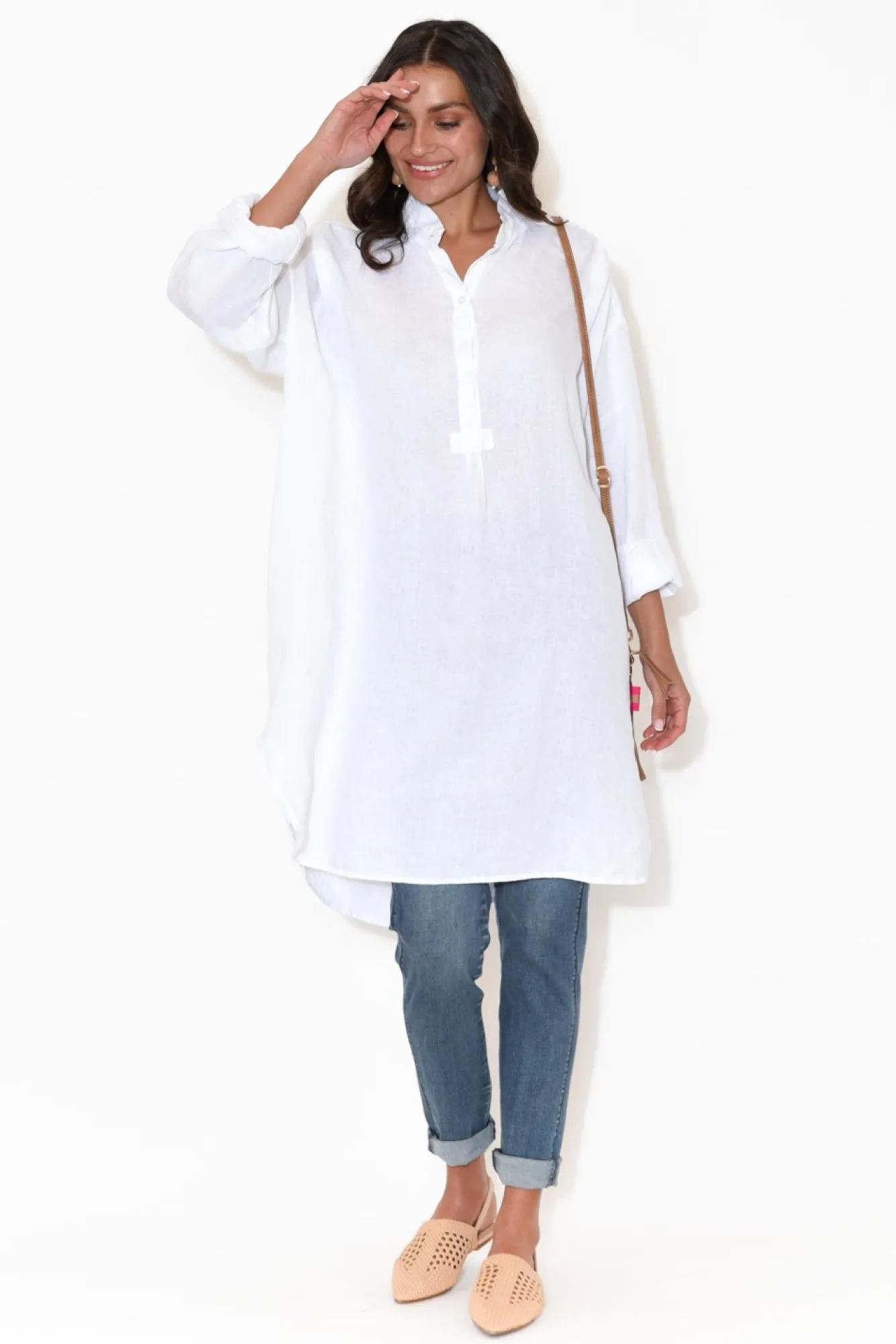 Fit: True To Size. Oversized Fit. Refer To Size & Fit Tab Below For Specific Size Recommendation NNfabric: 100% LinenNstunning Lightweight, Breathable And No-Stretch FabricNlovely Collared Neckline With Cascading Buttons Down BustNNfull Length Sleeves With Button Cuff Detail NNfloaty Tunic Silhouette Drapes Beautifully Down The Body – Perfect For Layering Over Pants NNtwo Discreet Hip PocketsNhi-Low Hemline Falls To Mid Thigh NNNcare: Cool Gentle Hand Wash RecommendedNNcolour: Crisp White