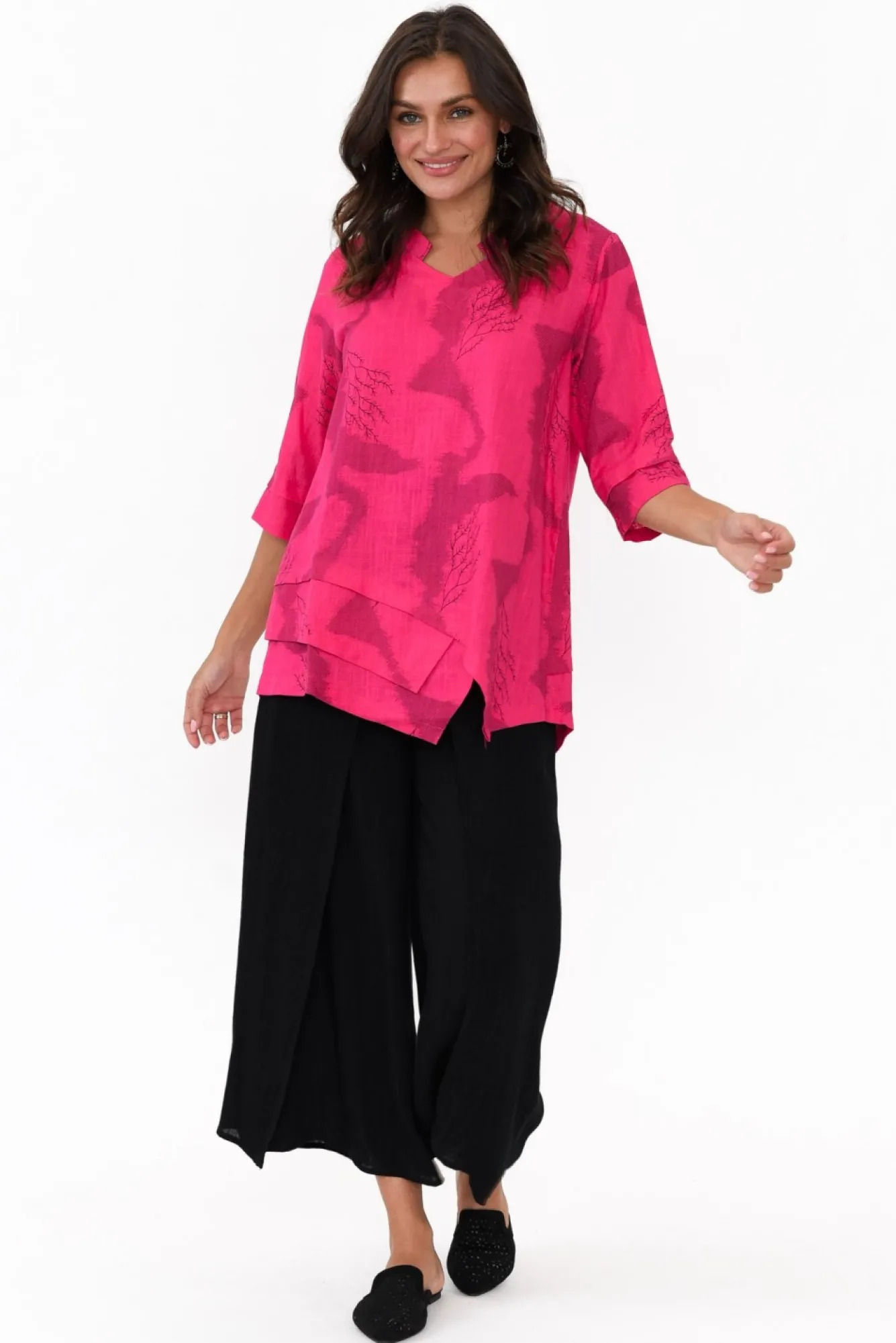 Fit: True To Size. Refer To Size & Fit Tab Below For Specific Size RecommendationNNfabric: 65% Linen, 35% CottonNconstructed From A Lightweight Linen And Cotton Blend Fabric Offers Wonderful Breathability And A Textured Hand Feel NNv-Neckline With Feature Cutout Detail NNtranseasonal 3/4 Length Sleeves Complete With Layered Cuff Neveryday A-Line Silhouette With Subtle Flaring At The Hips NNfun Layered Asymmetric Hemline Falls Below Hip Length NNNcare: Cool Gentle Hand Wash RecommendedNNcolour: Striking Hot Pink Base With Fine Abstract Line Print