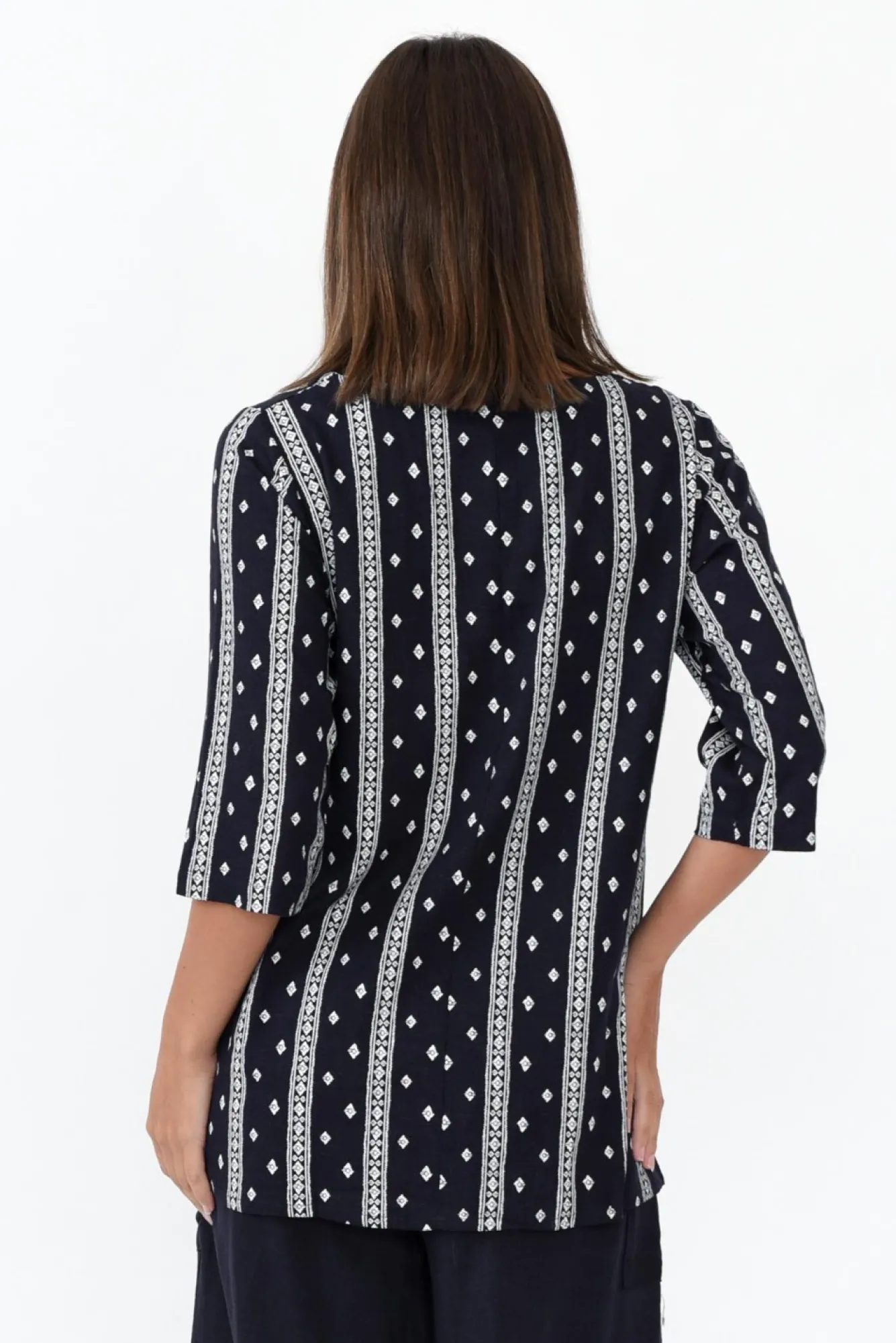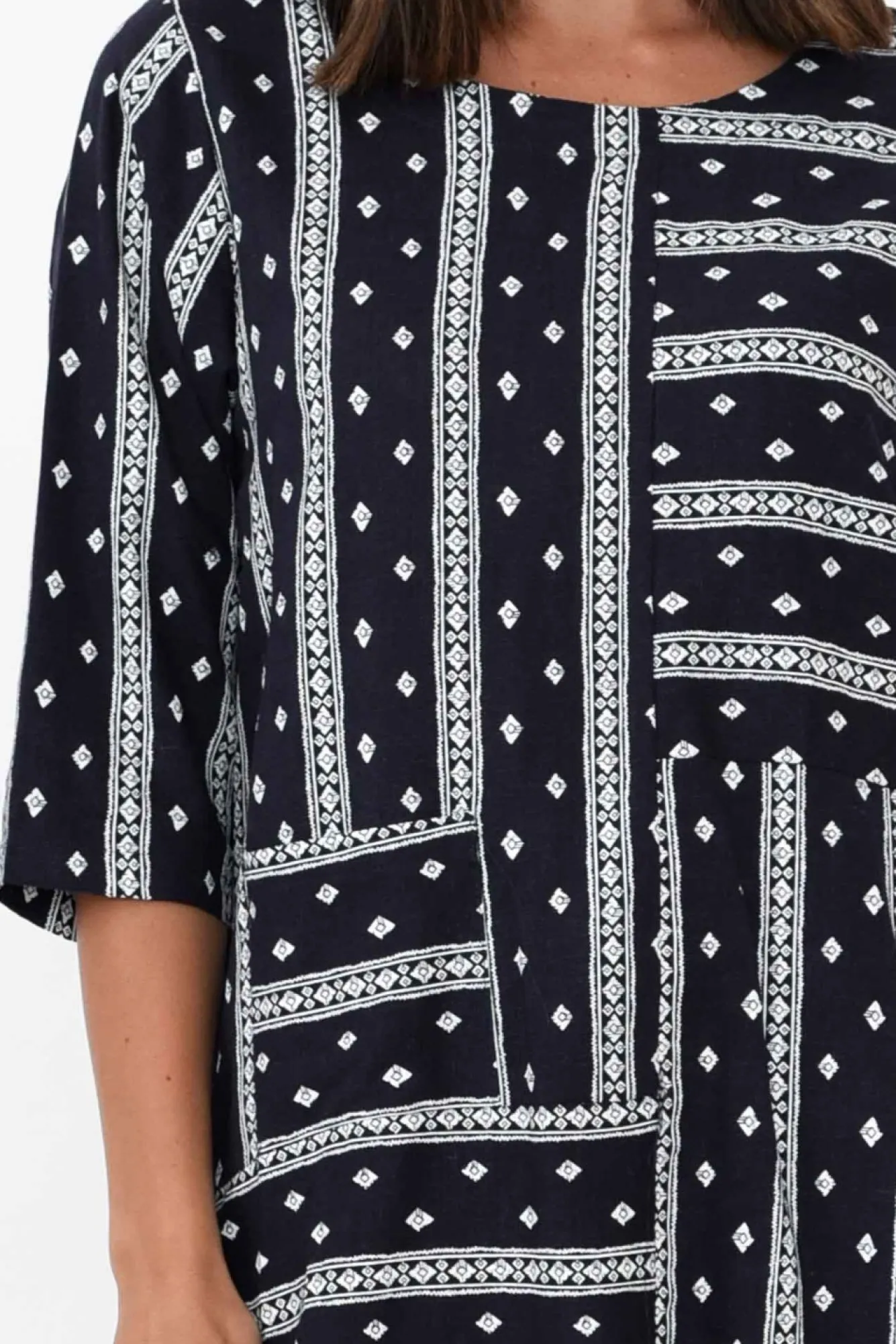 Fit: True To Size. Refer To Size & Fit Tab Below For Specific Size Recommendation NNfabric: 65% Linen, 35% CottonNlightweight And Breathable Blend Of Linen And Cotton Featuring A Classic Woven TextureNNround Neckline Sits At The Collarbones Nsimple 3/4 Length Sleeves Nflattering A-Line SilhouetteNNfeature Front Pocket On The Right SideNstraight Hem Falls To Comfortable Hip-LengthNNcare: Cool Gentle Hand Wash RecommendedNNcolour: Deep Oceanic Navy With Delicate White Aztec Print