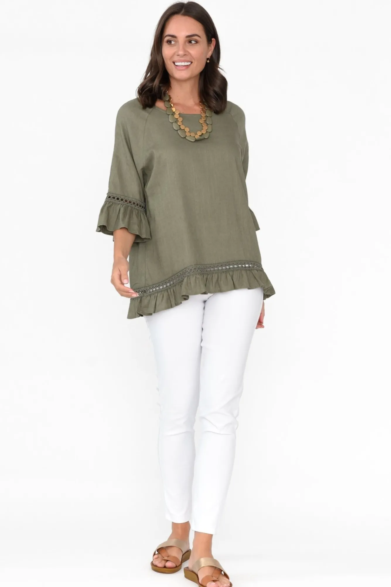 Fit: True To Size. Refer To Size & Fit Tab Below For Specific Size RecommendationNNfabric: 65% Linen, 35% CottonNbreezy, Lightweight And Non-Stretch Linen Cotton Fabric With A Woven Textured FinishNNclassic Round Neckline Skims The Collarbones N3/4 Length Sleeves With A Flared Frill Cuff NNmatching Ornate Trim Featured On The Sleeves And Hem For An Elevated Look Nversatile A-Line SilhouetteNNruffle Hemline Falls To The HipsNNNcare: Cool Gentle Hand Wash RecommendedNNcolour: Timeless Khaki Hue