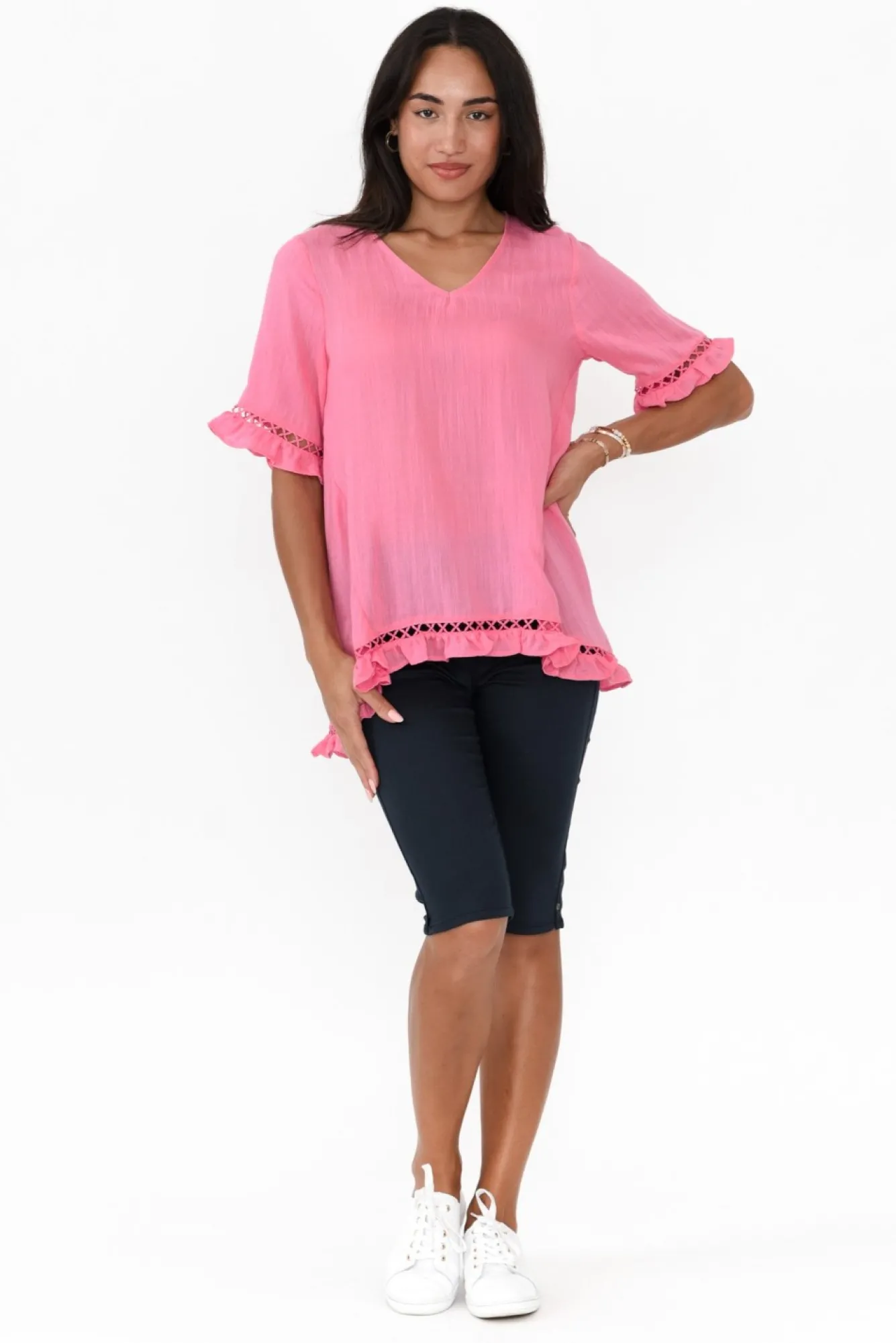 Fit: True To Size. Refer To Size & Fit Tab Below For Specific Size Recommendation NNfabric: Linen/RayonNlightweight, Non-Stretch Fabric With A Subtle Woven Textured Feel NNsoft V-Neckline Falls Below Collarbones NNlovely Half-Length Sleeves With Frill Cuff NNpink Criss-Cross Trim Detail Featured On Sleeves And Hem Ntimeless A-Line Silhouette Nfrill Hi-Lo Hemline Falls To Hip-Skimming LengthNNNcare: Cool Gentle Hand Wash RecommendedNNcolour: Flamingo Pink Shade